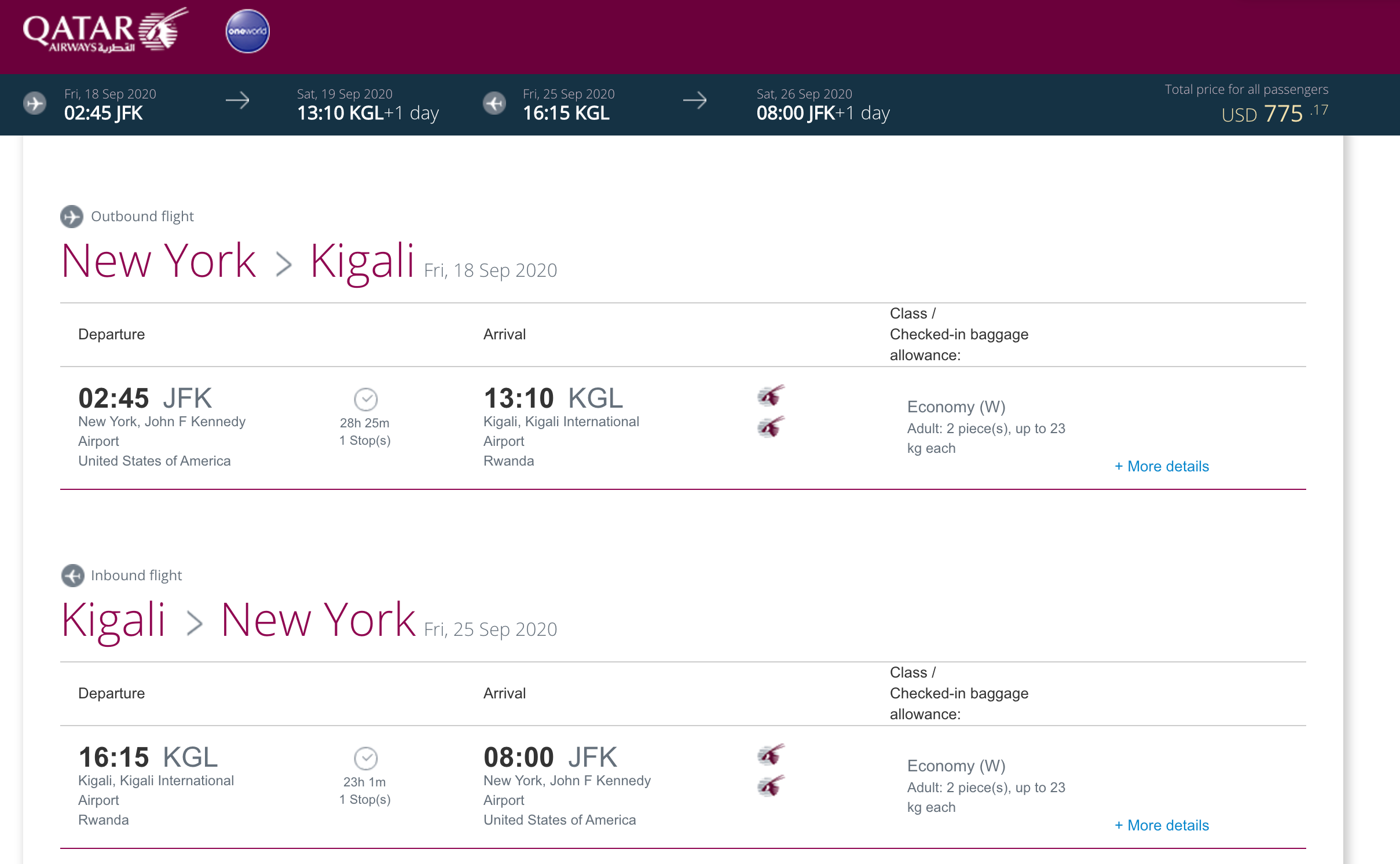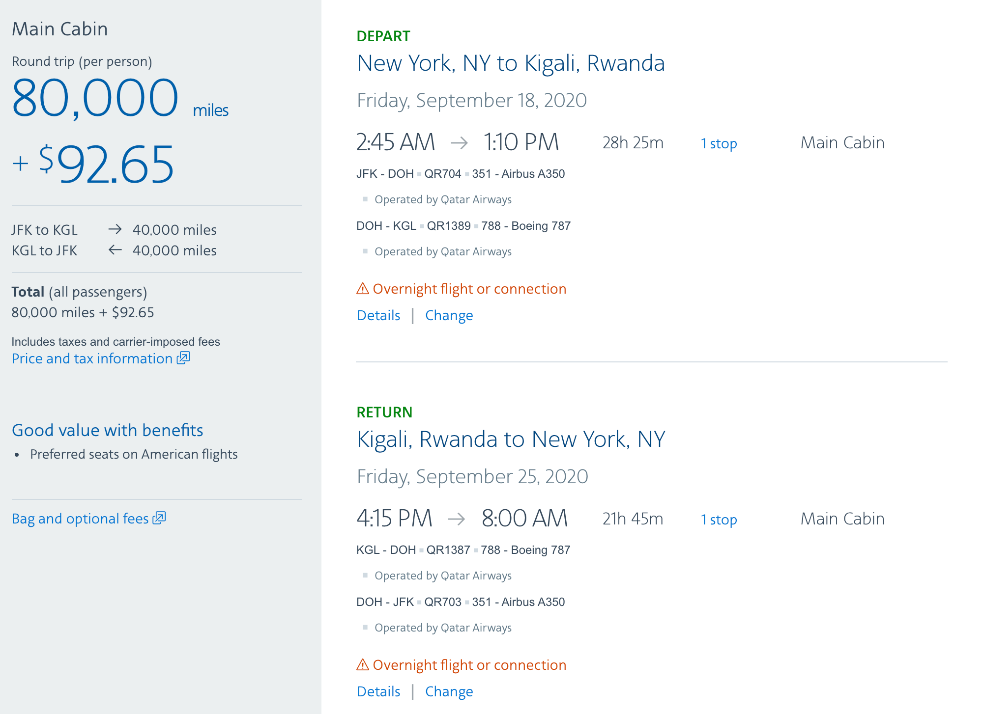I looked for flights for between September 18 to 25, and came up with several options, even with the cuts in capacity we've seen thanks to COVID-19. From New York, you could fly Qatar with one stop in Doha for $776 round trip in coach. The same flight can be booked using American Airlines miles for 80,000 AA miles and $93 in main cabin, or 150,000 AA miles and the same $93 in business class, all on Qatar Airways.