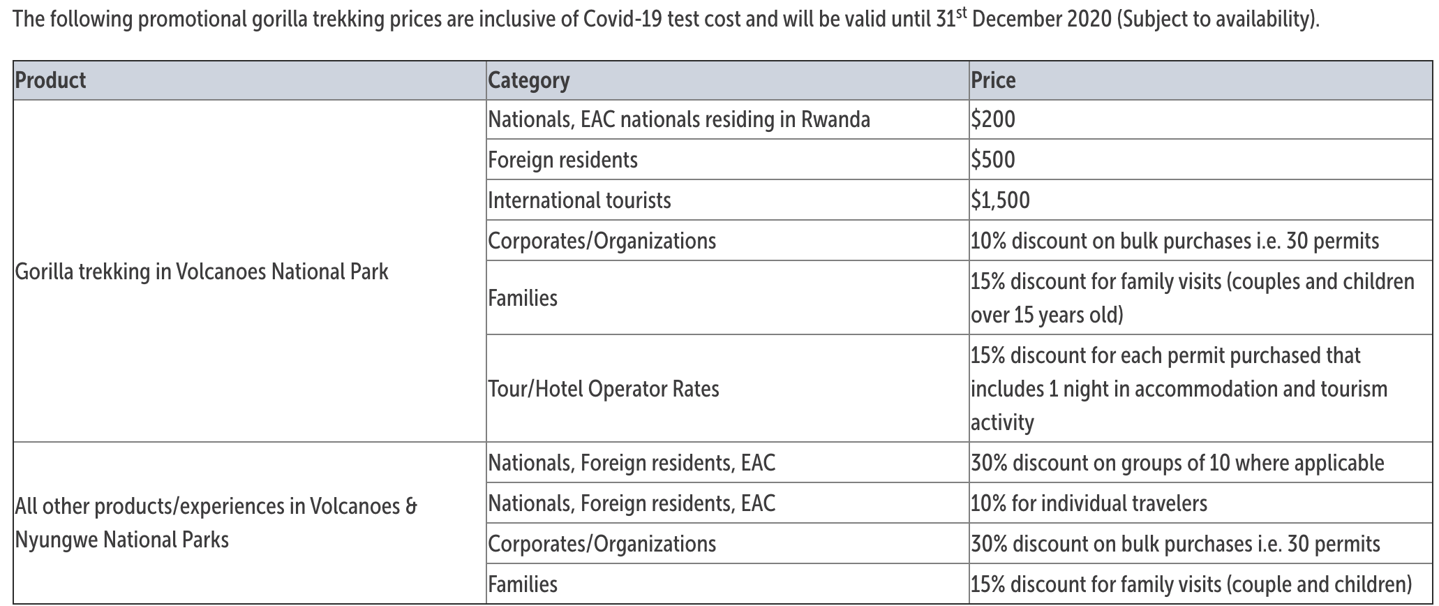 And the government lays out how much you'll need to spend for some of the most popular activities, according to the chart below. Note that international tourists pay a much higher fee for activities such as trekking with gorillas. Apparently, the costs of testing for coronavirus are being included in tour group fees.
