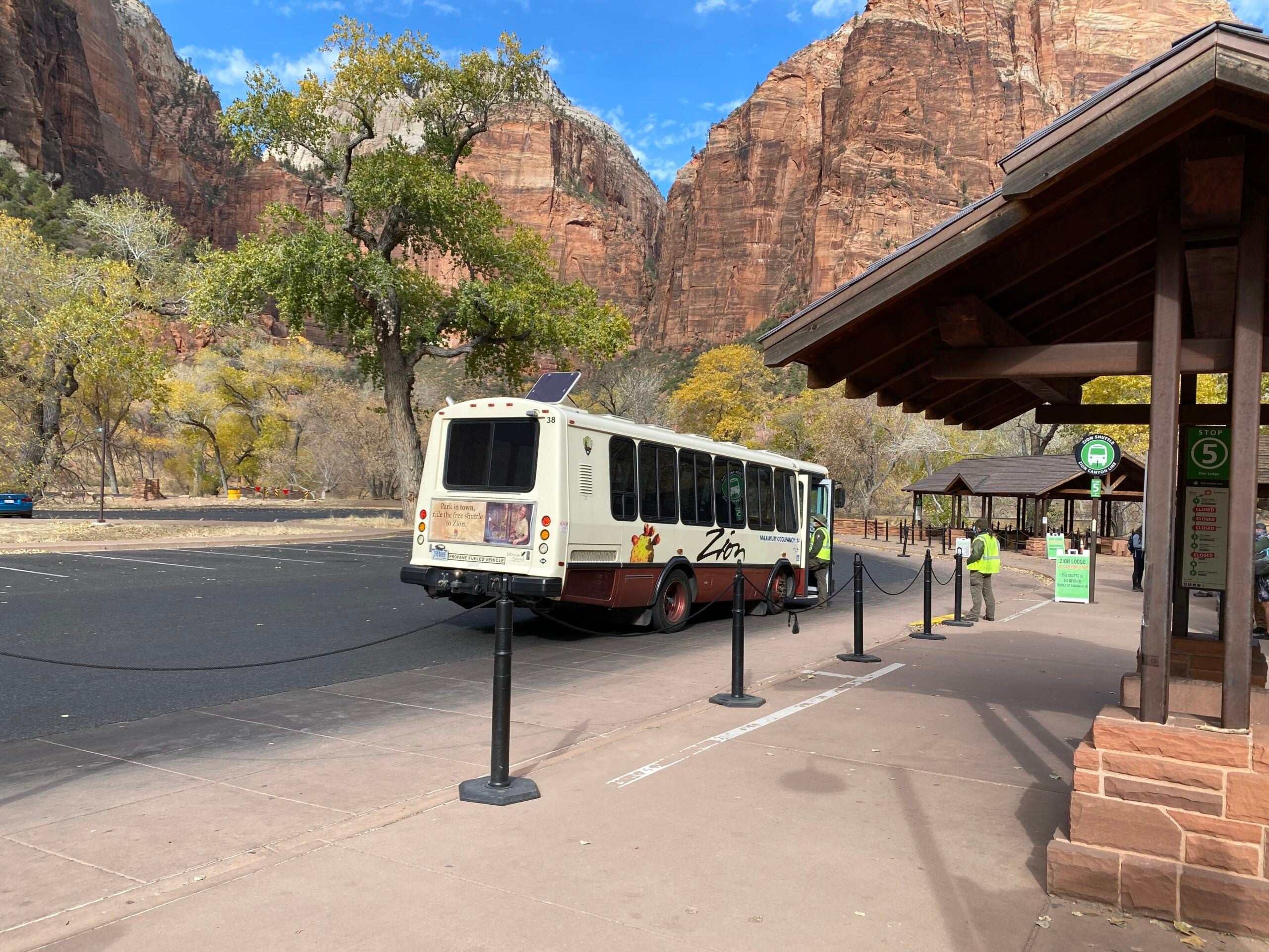 The park service advises that in the busy season, parking lots fill by early- to mid-morning and that your best course of action is to park in Springdale and take the shuttle bus to the park. This is one of two shuttle routes.