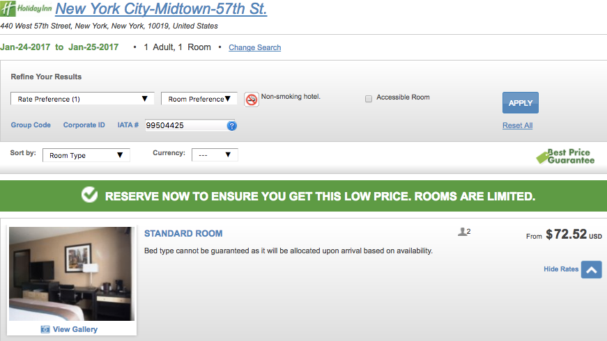 The total cost (before taxes) of booking directly through the Holiday Inn's website for a stay from January 24 at 3:00pm to January 25 at 11:00am (standard hotel check-in and check-out times): $73