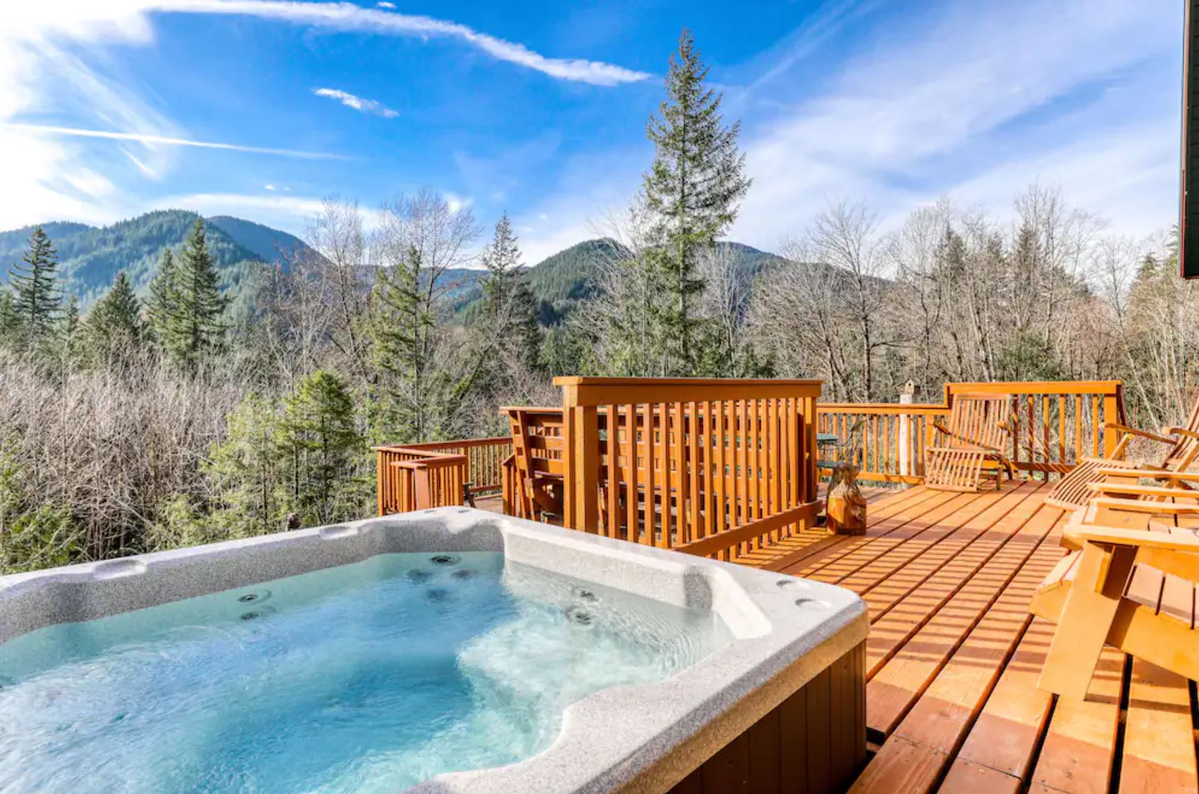 Welches mountain cabin offers a dog-friendly rental home that features a hot tub and a sauna — perfect for relaxing after a long day of hiking. The two-bedroom, two-bathroom home sleeps up to six guests and is within walking distance to the 33-mile Salmon River and Cascade Mountain Range, which stretches from Northern California all the way to British Columbia.