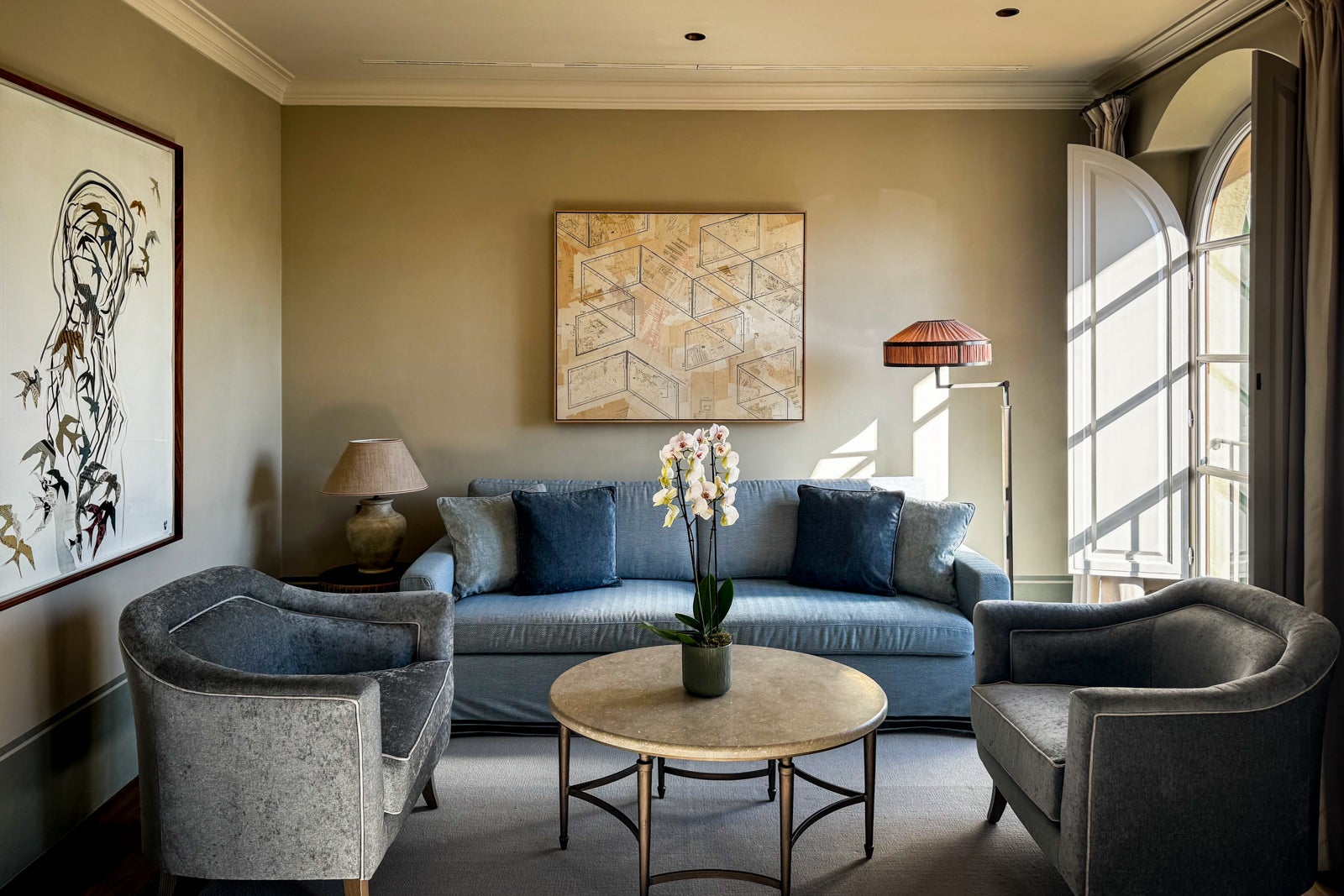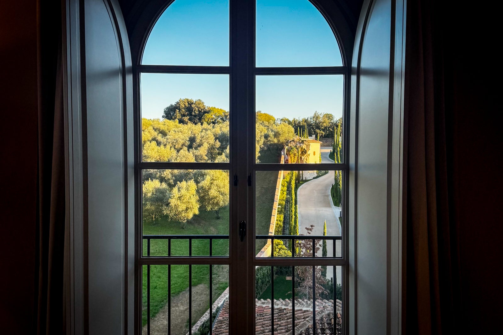 In the guest rooms and suites, massive shuttered windows open to reveal a tranquil scene of olive groves, farmland and glimpses of Florence in the distance. The spaces feel at once fresh, elevated and unfussy, with modern Italian furnishings and locally sourced materials complementing the buildings’ historic bones.