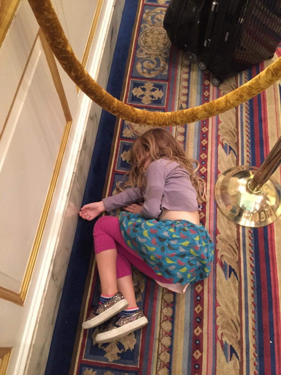 After a post-midnight landing, my then 4-year-old daughter was passed out on the way to the hotel. I somehow carried her and the bags from the Uber to the hotel's check-in desk, but then had to place her on the floor as I checked in.