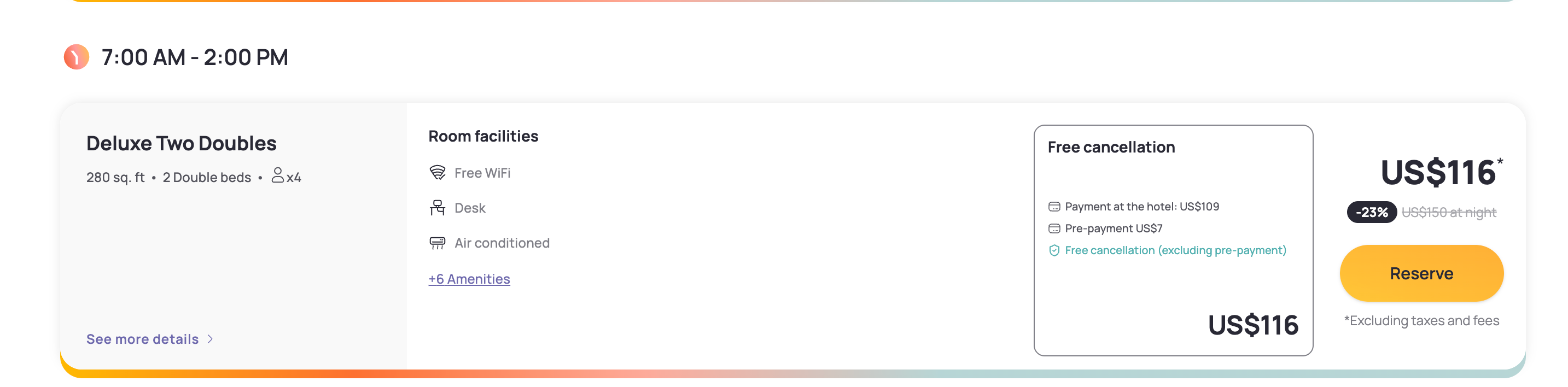 For example, on the Dayuse.com site I used to book this room, you often just pay a small fee ($7 on my booking) to book, with the bulk of the payment due directly at the hotel at check-in. On my booking, I could even cancel for free until two hours before the end of the booking time slot in case our plans changed at the last minute, which of course happens with flights.