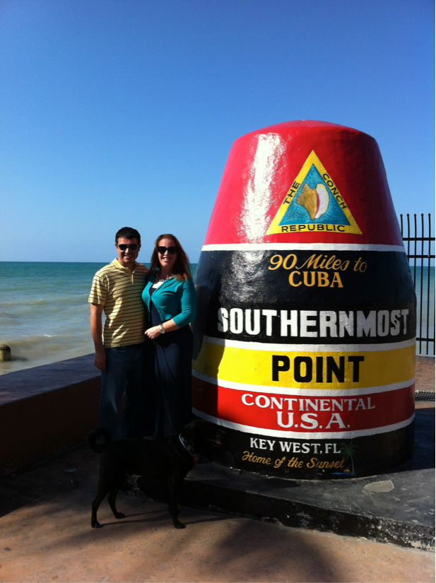 Me, my wife, and our pup pose (sort of!) in front of the Southermost Point marker.