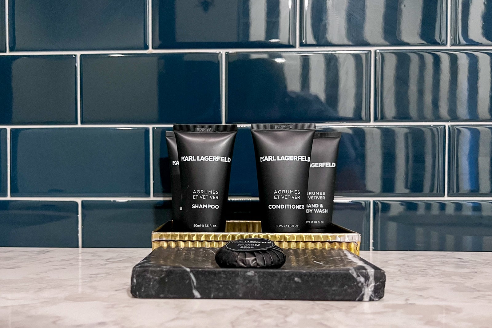The bathroom impressed me the most with its large walk-in shower, dual vanity and Karl Lagerfeld amenities.