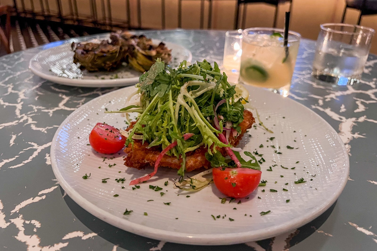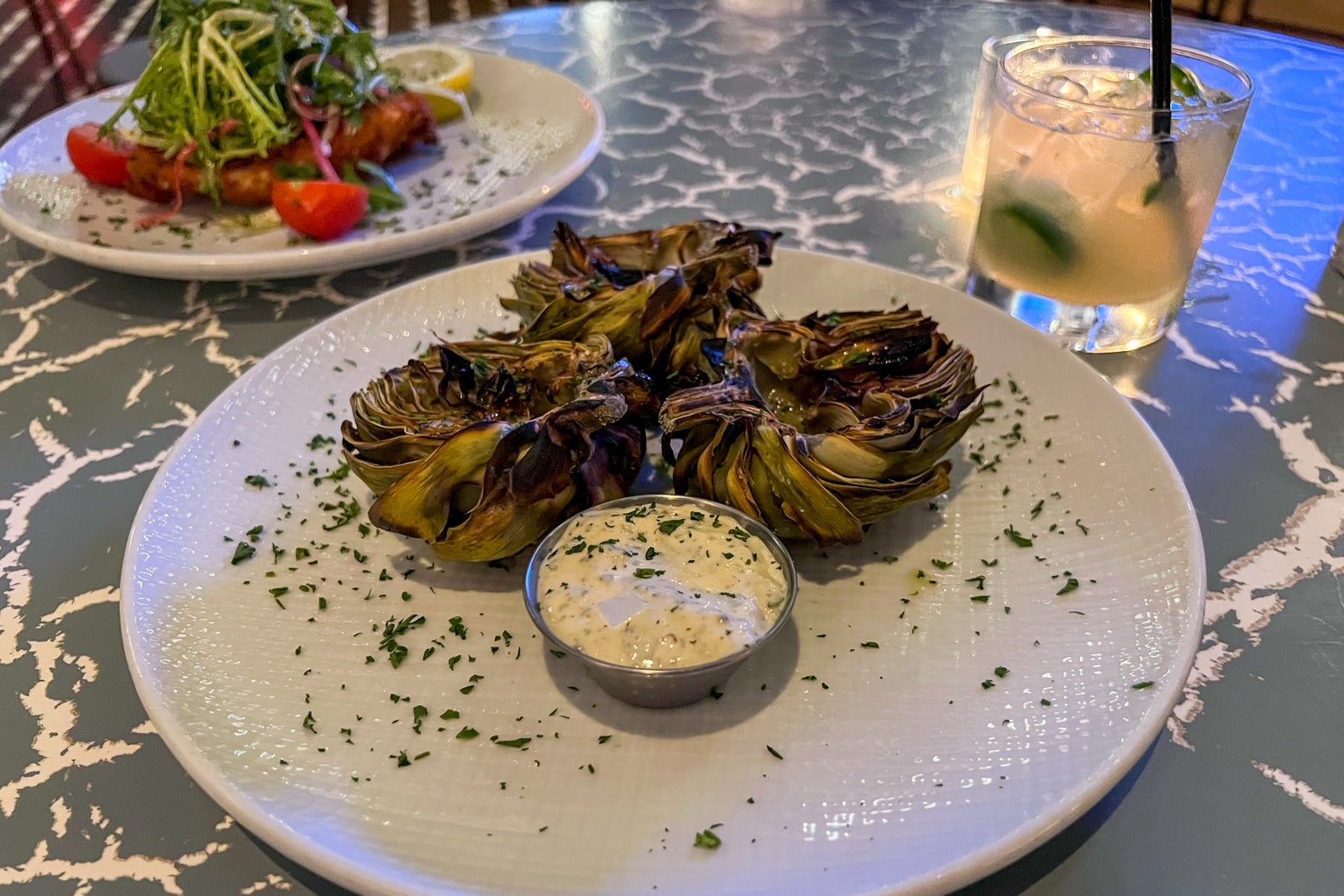 Grilled artichokes with a creole remoulade ($16) were a fresh and hearty way to kick off my late supper. I followed that with chicken paillard served alongside a frisee arugula salad, heirloom tomatoes and honey mustard vinaigrette ($22). I rounded this out with a picante margarita ($14) off the cocktail menu.