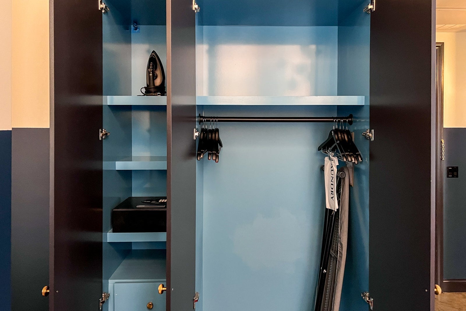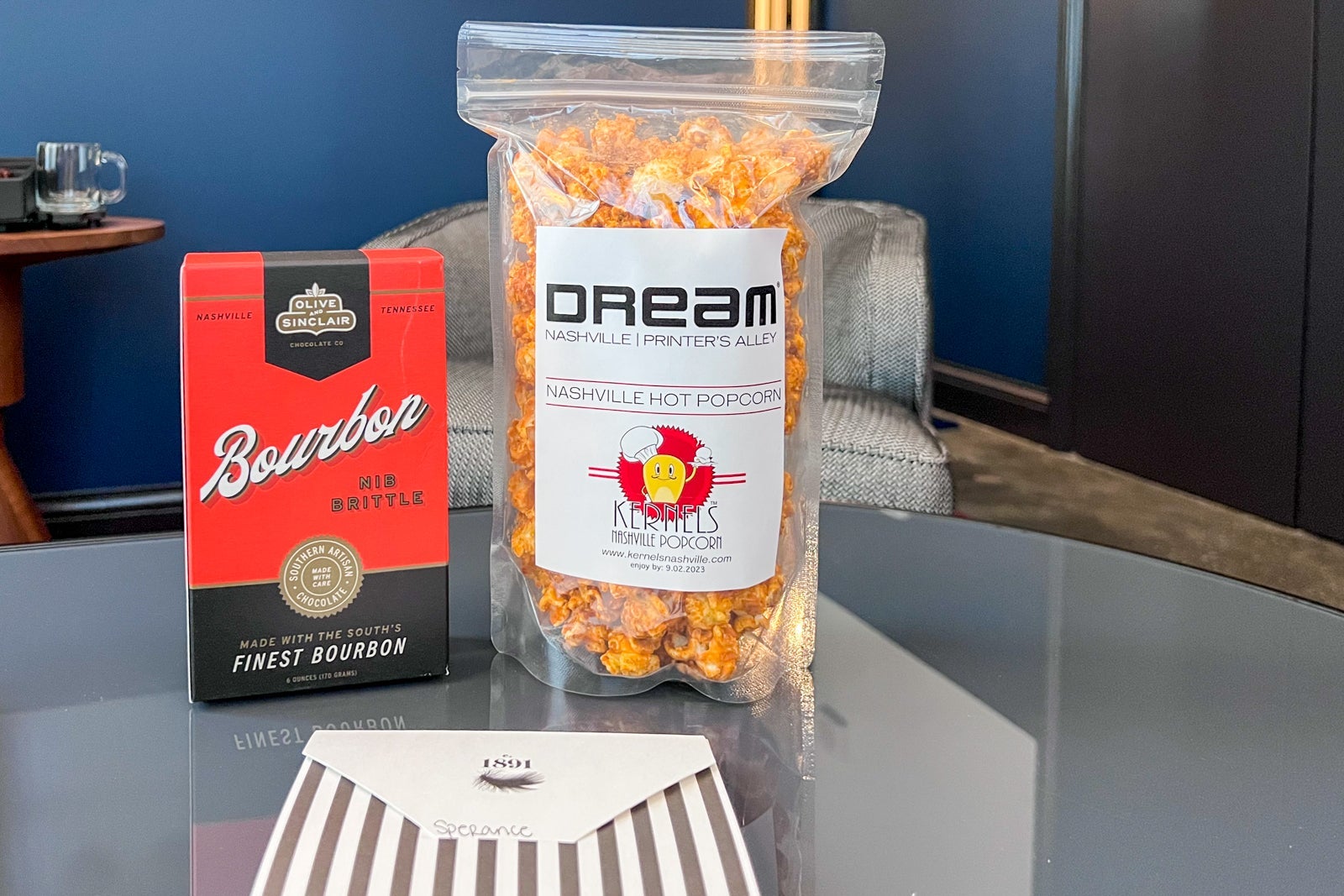 There were other nice touches to go with the room, like spicy popcorn from Kernels Nashville Popcorn and Bourbon Nib Brittle from local confectioner Olive and Sinclair. Ample storage included mainstays like a luggage rack, safe and iron.