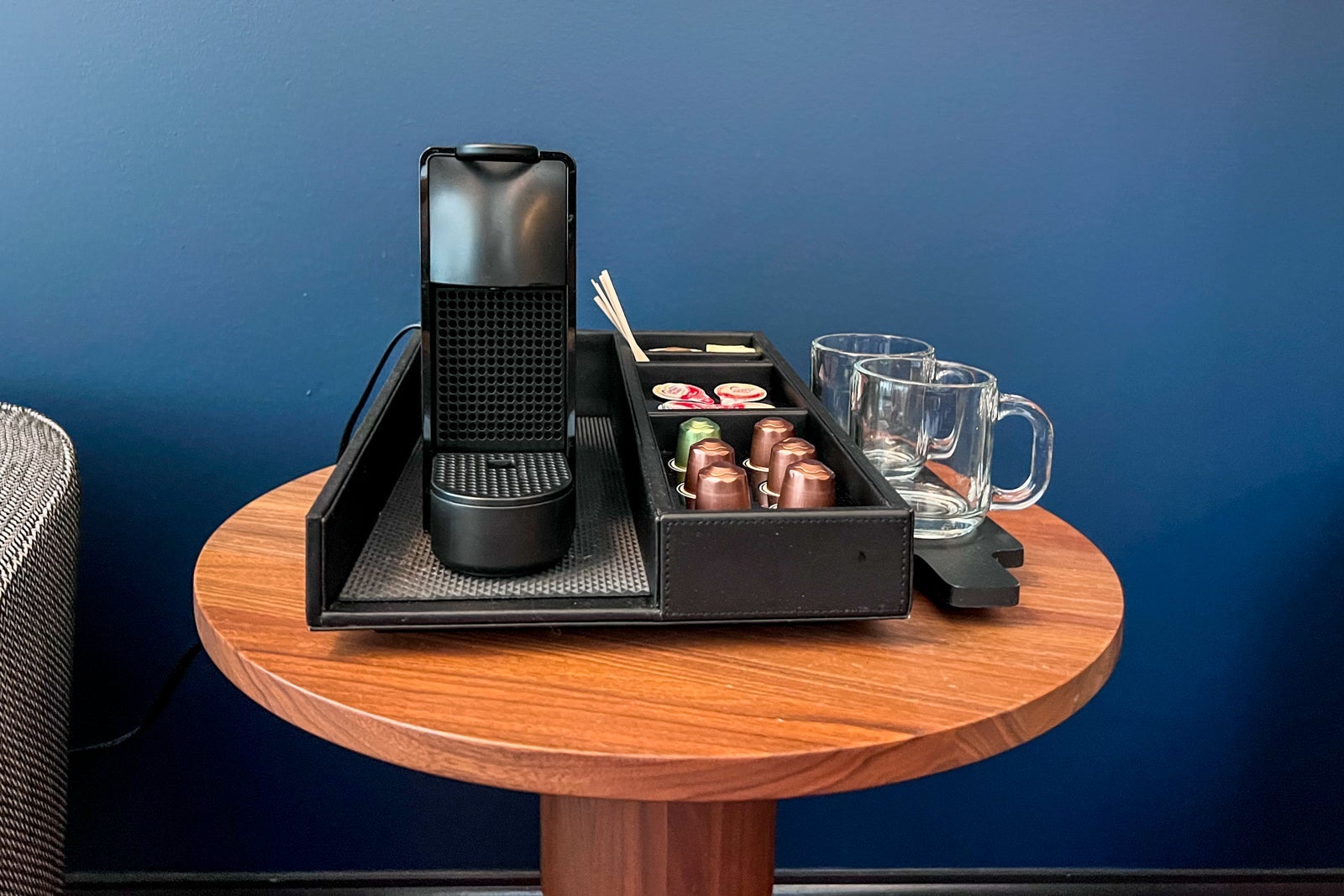 The room included a cozy seating area with a velvet couch, two chairs, a Nespresso machine and a coffee table. The bedroom on the other side of a divider featured a king-size bed, a workstation and a refrigerator (stocked with the two free bottles of water that come from being a Discoverist or higher).