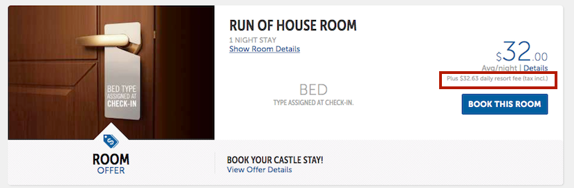 When you get below the five-star Vegas resorts to properties like Luxor, Circus Circus and Excalibur, the resort fee adds a heap of insult onto your trip. Look at the following screenshot of a reservation for a weekday night at Excalibur, where the resort fee is higher than the room rate: