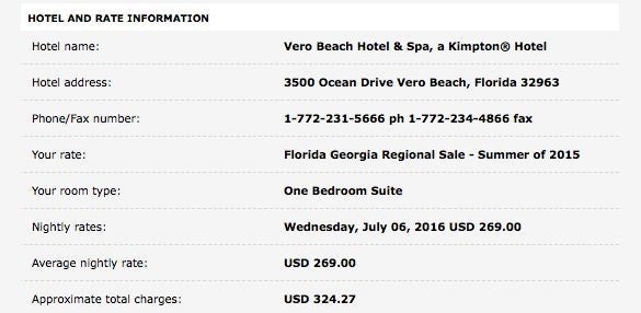 The genesis of this post began back in June when a friend and colleague notified me of a very low rate at the Vero Beach Hotel & Spa (a fantastic property that I've reviewed twice for the blog, in May 2015 and again in September 2015). Standard queen rooms were pricing at just $19 for the Wednesday night after the Fourth of July holiday weekend, and since the hotel is just a short 30-minute drive from our house, we decided to book. I even splurged on an upgrade to a one-bedroom suite for an extra $50, so our total price was $102.27 ($69 base rate plus $33.27 in taxes and resort fees). Minutes later, I had a confirmation email in my Inbox: