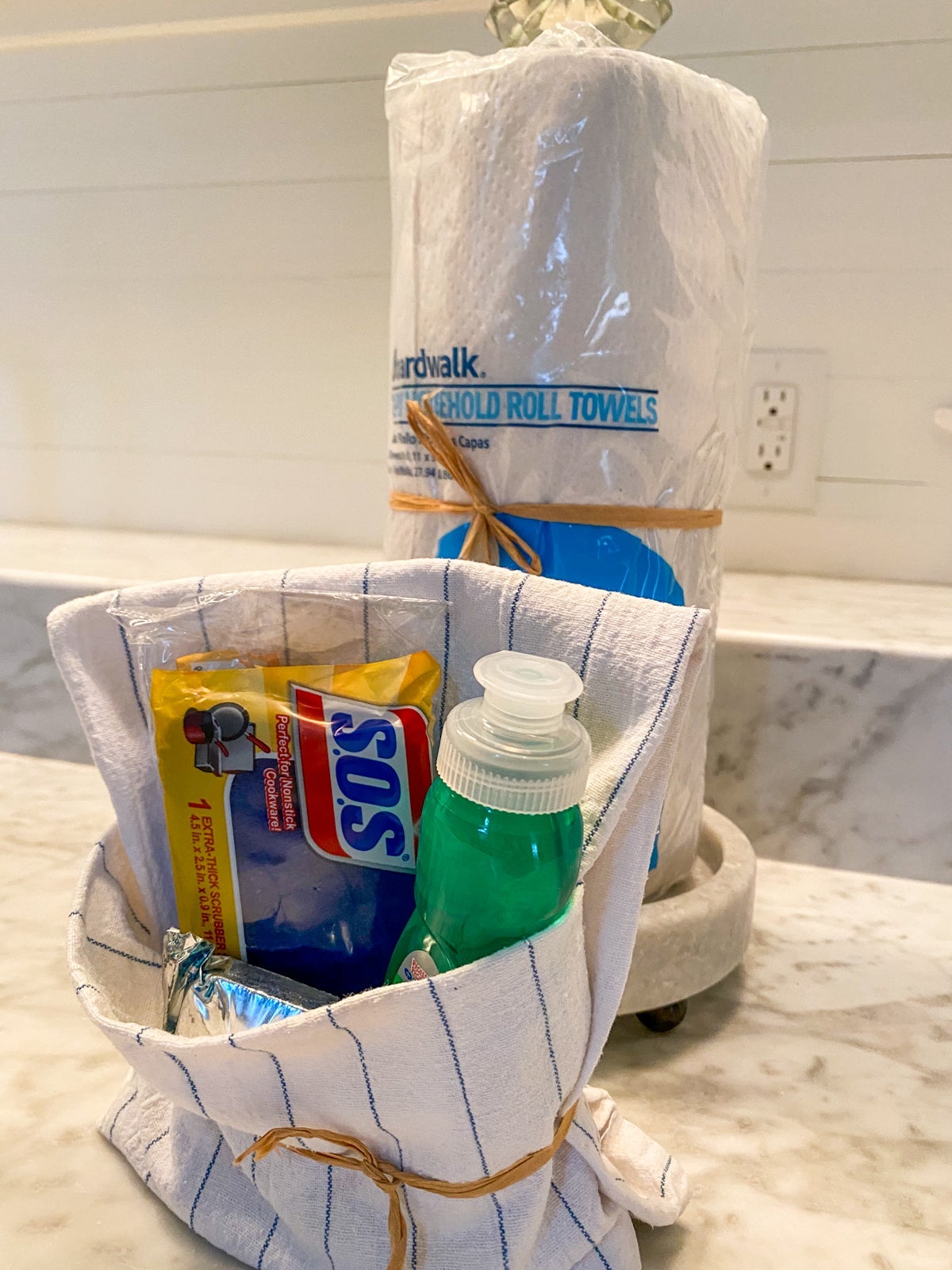 That should include at least one roll of paper towels, a full roll of toilet paper per bathroom, dish soap, dishwasher soap, body wash, shampoo, laundry detergent for two loads of laundry, a couple of trash bags, etc. (I'd even argue that enough coffee for the first morning is essential.)