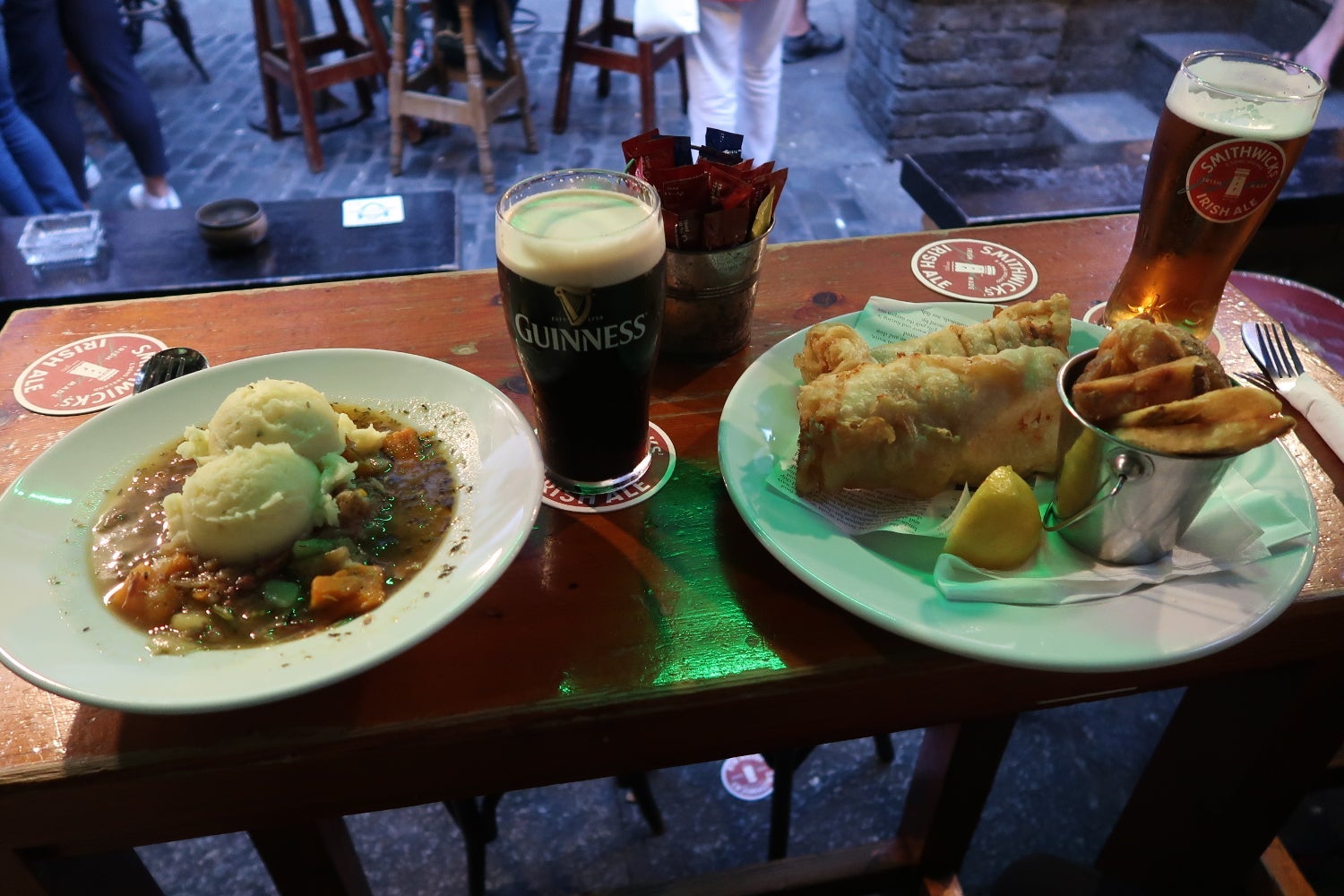 We grabbed a table in the crowded outdoor garden, ordered Irish stew (€15.50 or about $18) and fish and chips (€15.50 or about $18) and enjoyed a Guinness and a Smithwicks Blonde. Although there were clearly other tourists at the bar, we were surprised to see locals as well.