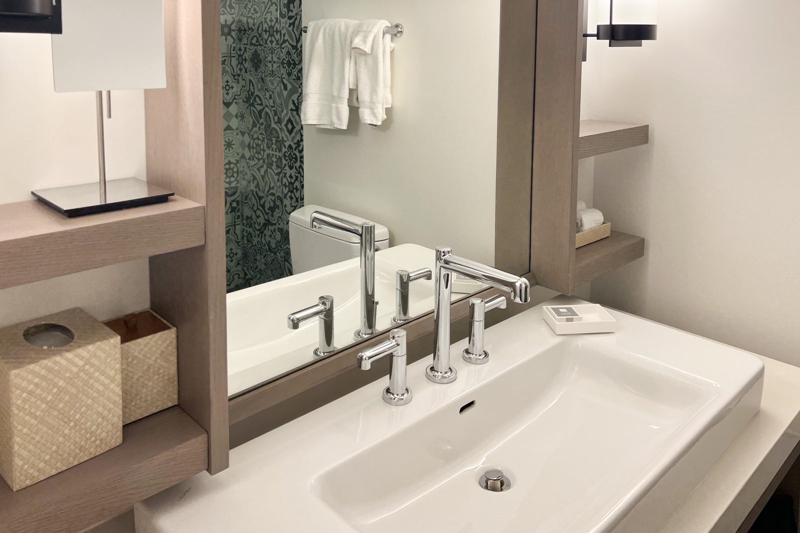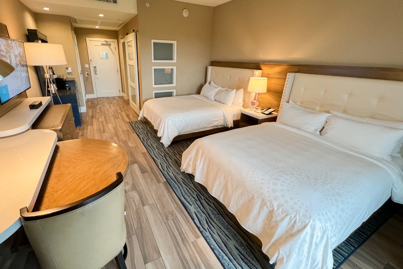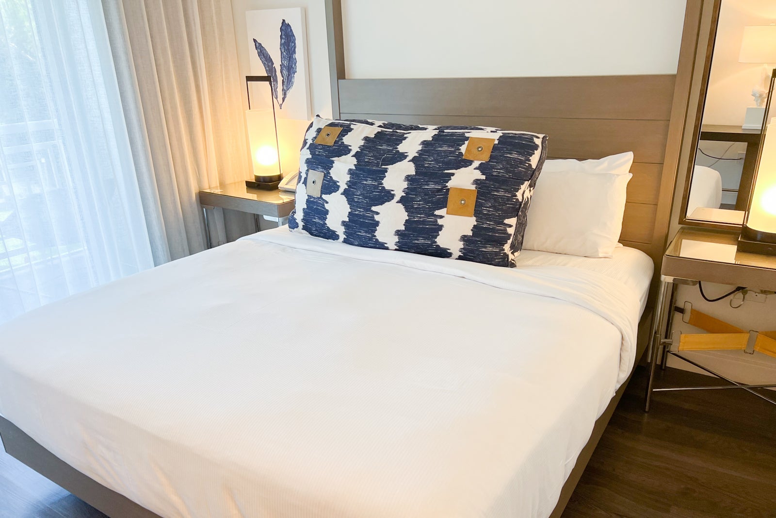 There was plenty of counter space and outlets, as well as a bathroom thoughtfully designed to be just as functional as it was beautiful. I loved the modern decor in white, tan and blue hues, which felt like an updated version of your stereotypical beach hotel. The comfortable beds were a welcome bonus, too.