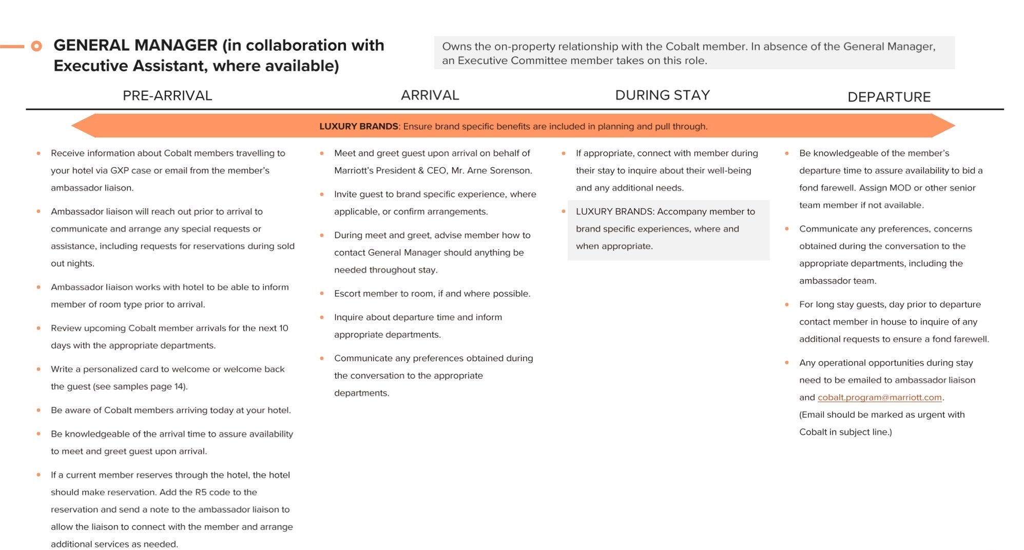 The 32-slide deck covering the Cobalt program goes into impressive detail, even delineating each hotel staff's responsibility when a Cobalt guest makes a reservation. The slide deck starts with the GM's duties and goes all the way down to housekeeping. Here are a GM's responsibilities for a Cobalt member starting with pre-arrival and carrying through departure: