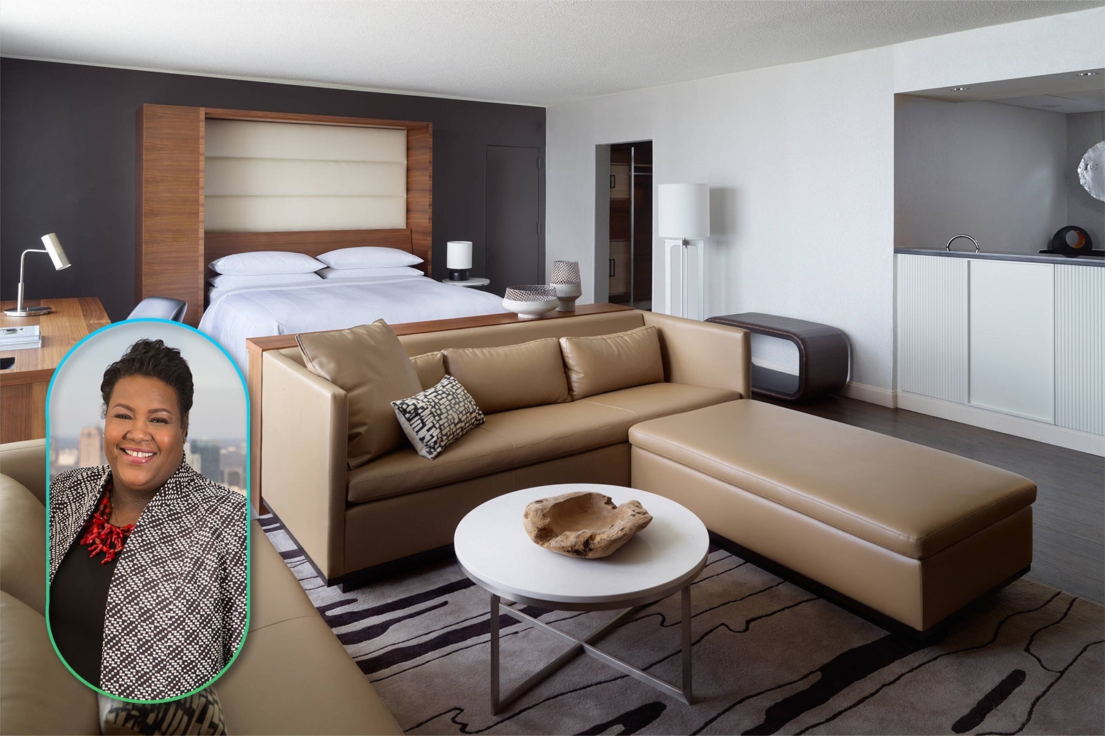 While the 329-room JW Marriott offers light, airy accommodations with butterfly artwork above the beds and alcoves with floor-to-ceiling windows, the Douglas features a more masculine feel (think: concrete ceilings, dark wood headboards and leather furnishings) in its 188 guest rooms and suites.