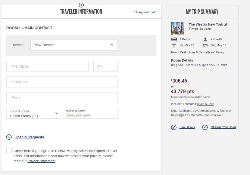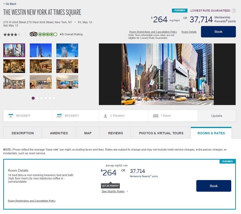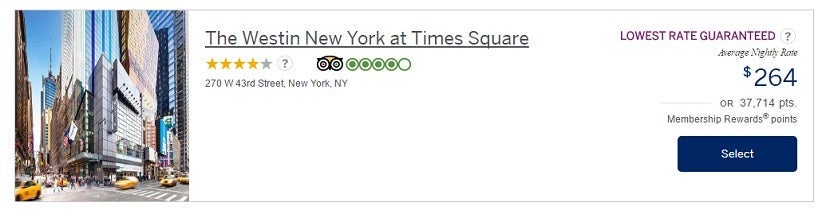 As you can see, Amex's website shows that the The Westin New York at Times Square can be booked for $264 or 37,714 Membership Rewards points. Or can it?