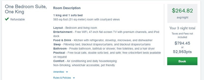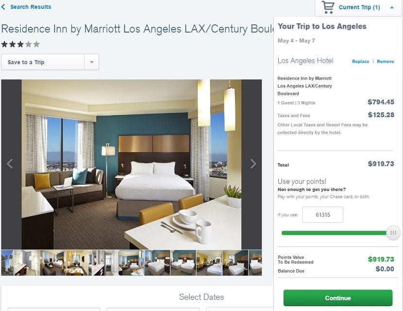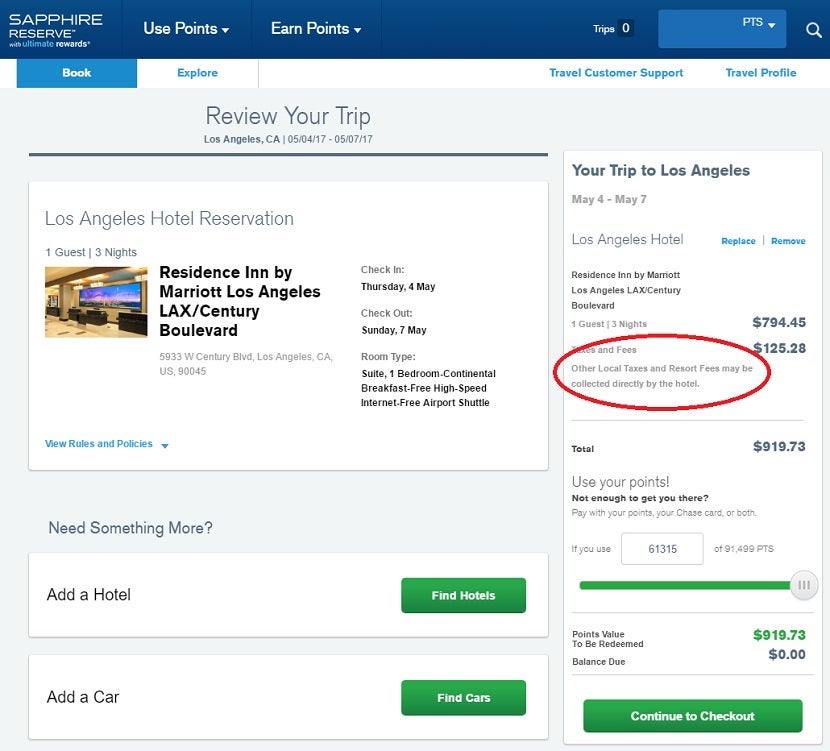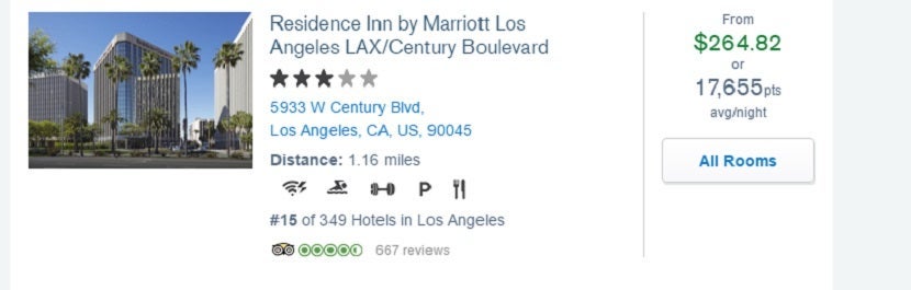 For example, the initial search results showed the Residence Inn by Marriott Los Angeles LAX/Century Boulevard for $264.82 or 17,655 points per night, and there was no mention of additional taxes and fees.