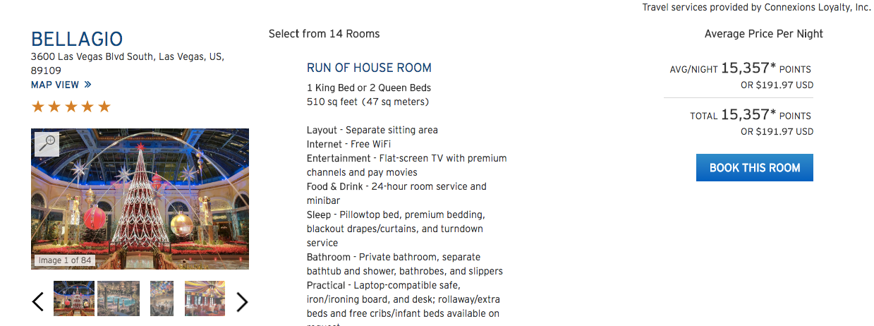 I checked the Bellagio Hotel in Las Vegas, and found this price of $191.97 or 15,357 ThankYou points.