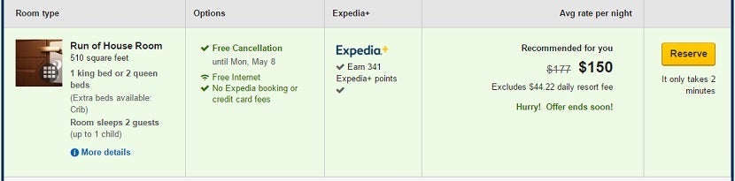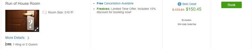 The initial search showed a room for $150 per night, but that turned out to be a far cry from what you would eventually have to pay.