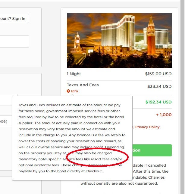 When booking a hotel through this mobile app, the taxes and fees are not disclosed until the end of the transaction, and there's no disclosure at all of mandatory resort fees.