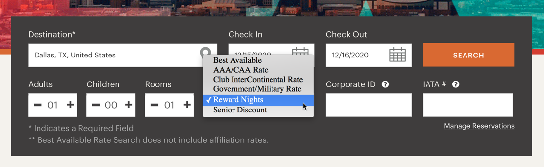 To search, start at www.ihg.com. Enter your search criteria, and be sure to select the Reward Nights option in the Rate Preference drop-down.