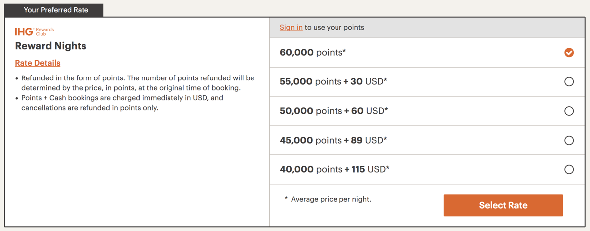 If you don't have enough points for a full hotel stay, you can make a Points + Cash booking for a discount on your next hotel booking. The exact rate options for this redemption vary, but they're typically provided in discounts of 5,000 points off the full award rate. For example, sticking with the Crowne Plaza example above, you have the following Points + Cash options: