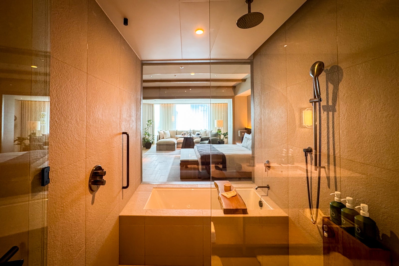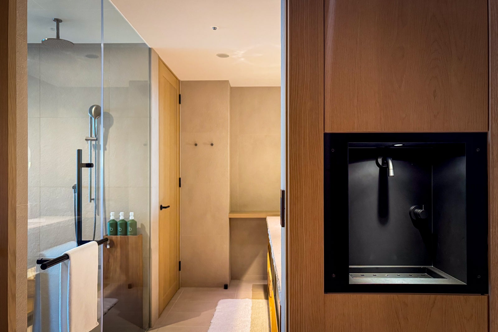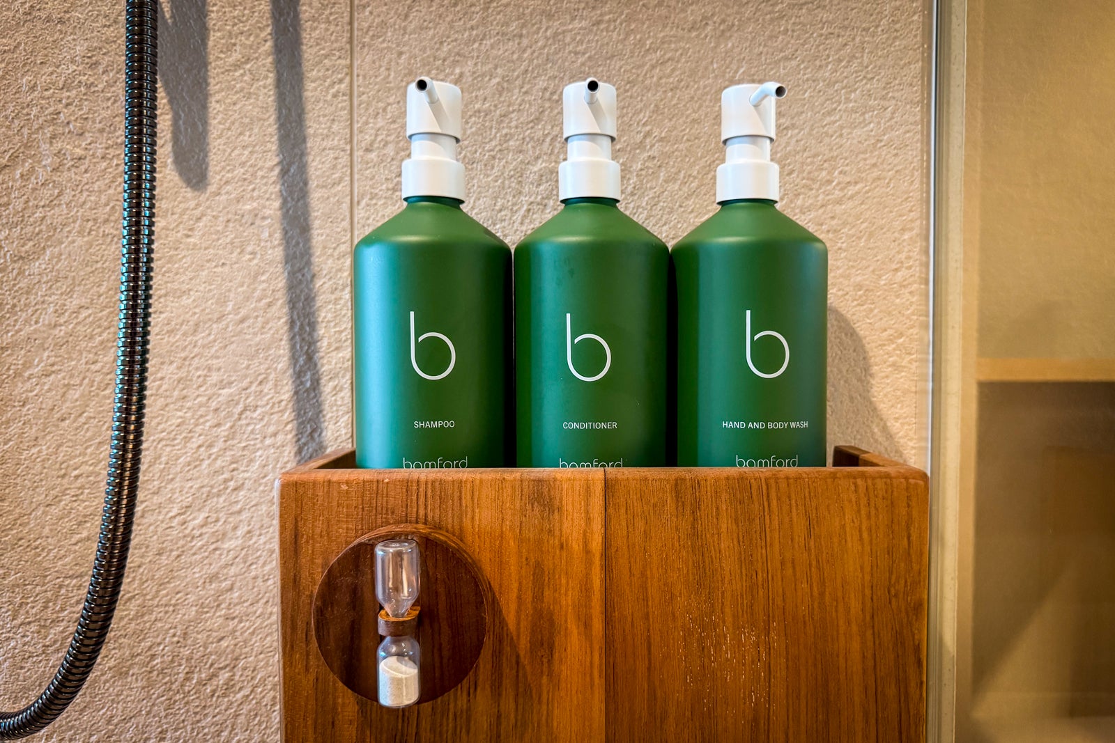 Glassed-in bath-shower suites feel like your own individual onsen experience and come stocked with Bamford amenities plus my favorite cheeky touch: a little hourglass in the shower, should you feel the need to limit your water usage by trying to soap up and rinse off before the sands run out.