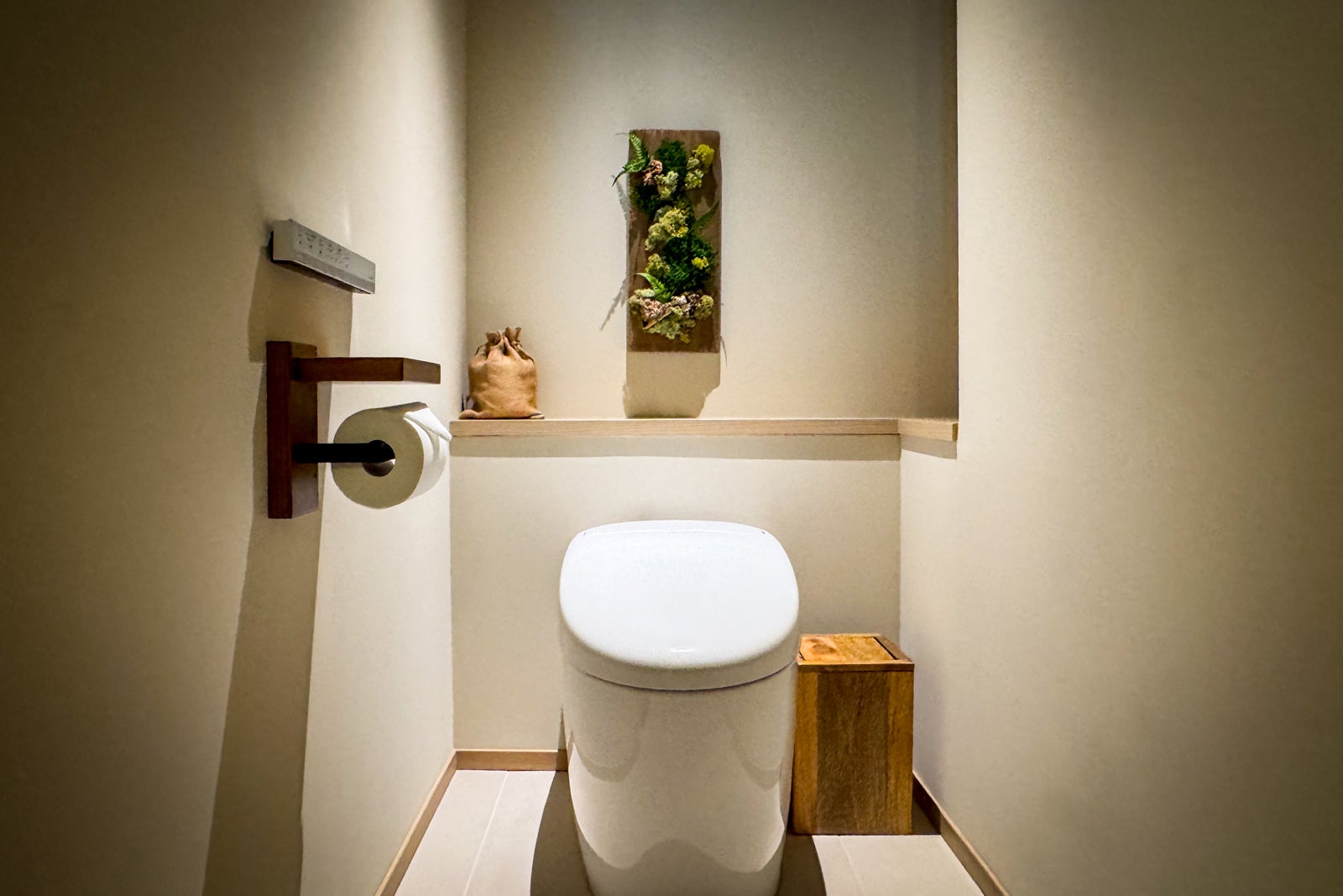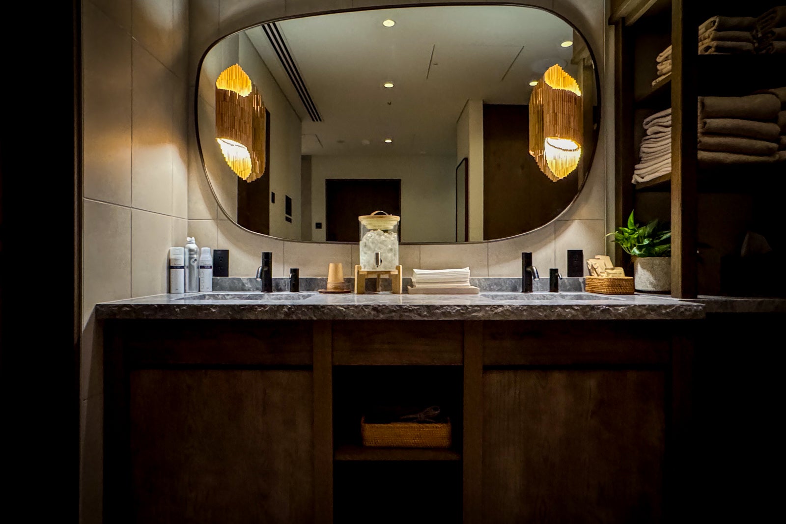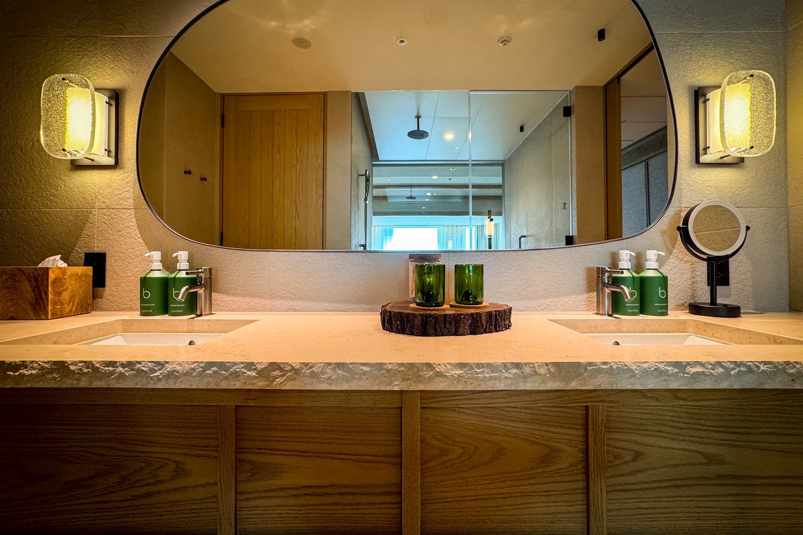 Glassed-in bath-shower suites feel like your own individual onsen experience and come stocked with Bamford amenities plus my favorite cheeky touch: a little hourglass in the shower, should you feel the need to limit your water usage by trying to soap up and rinse off before the sands run out.