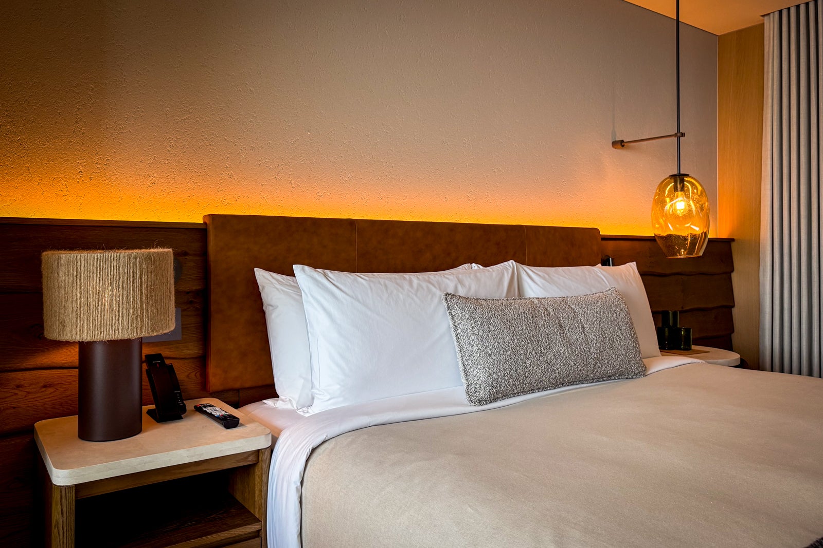 But this 1 Hotel also feels distinctly Japanese, with design elements that reference traditional ryokan, or inns, such as live-edge shiplap bed backs that call to mind traditional rural Japanese houses, woven carpets reminiscent of tatami mats and wavy wall art resembling handmade fish traps.