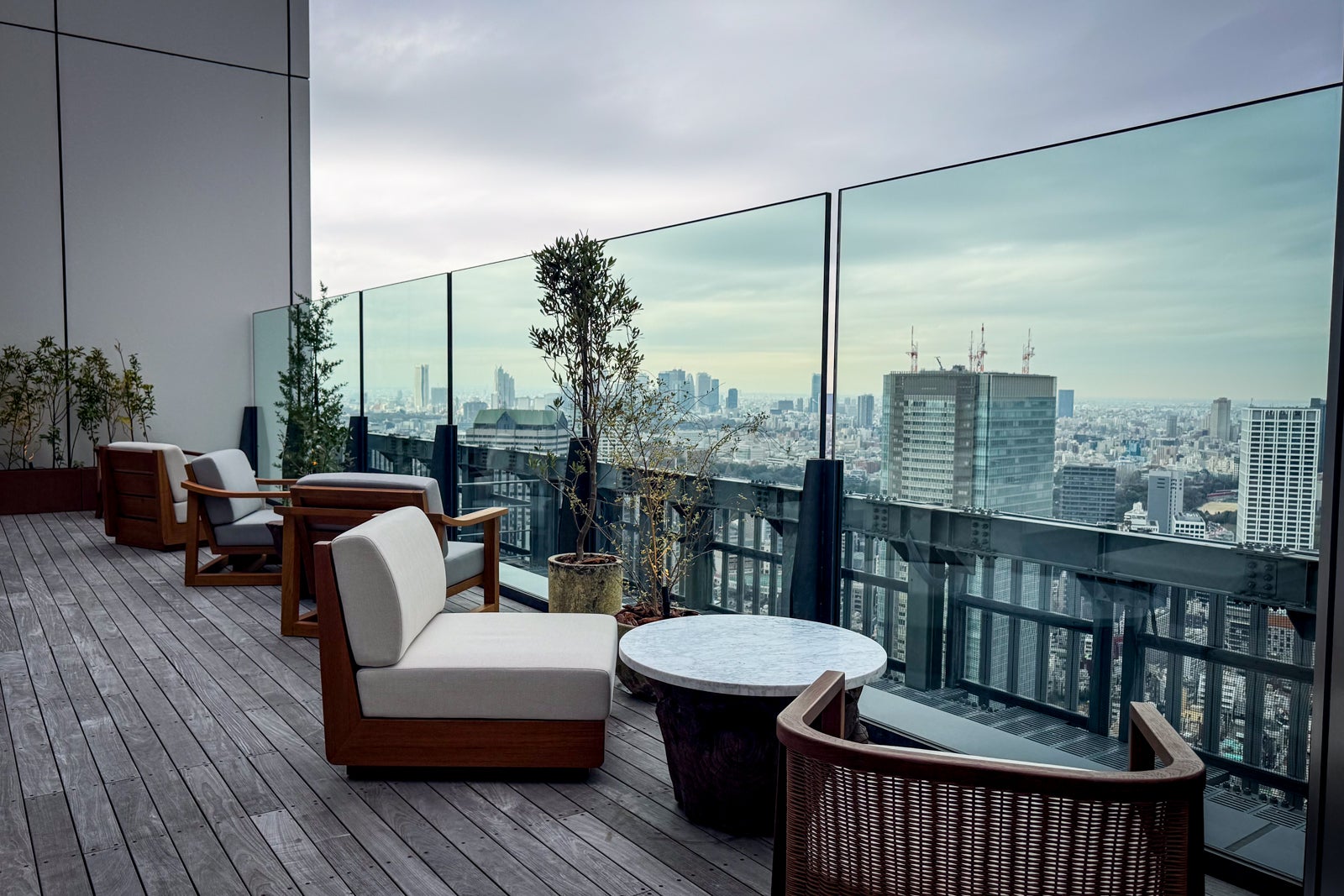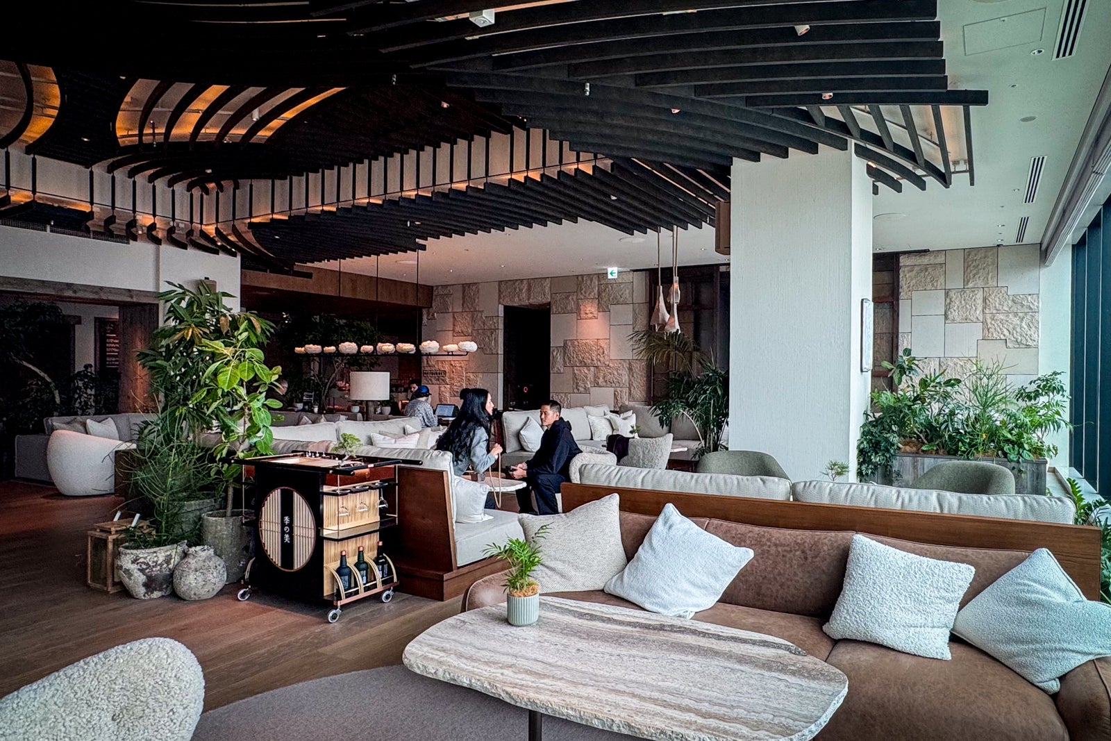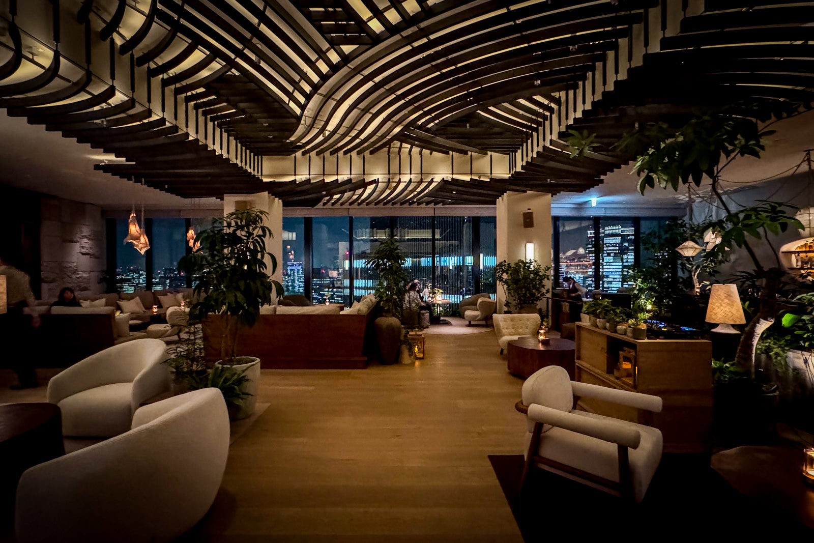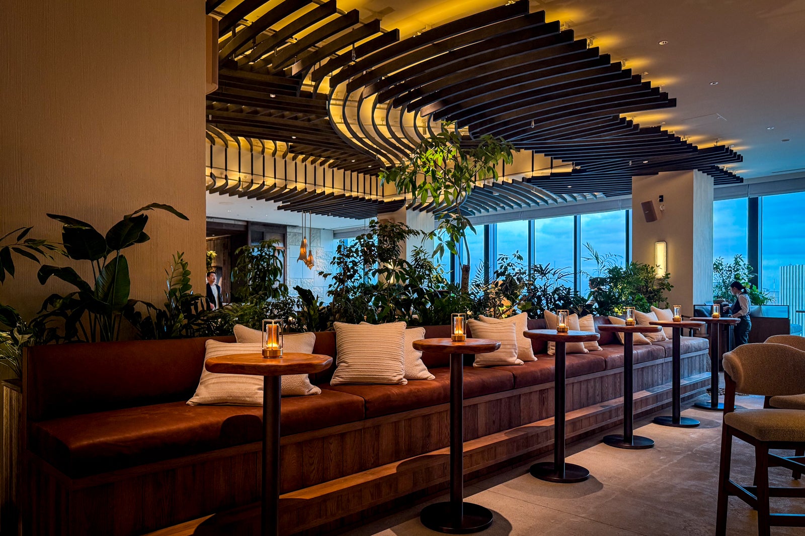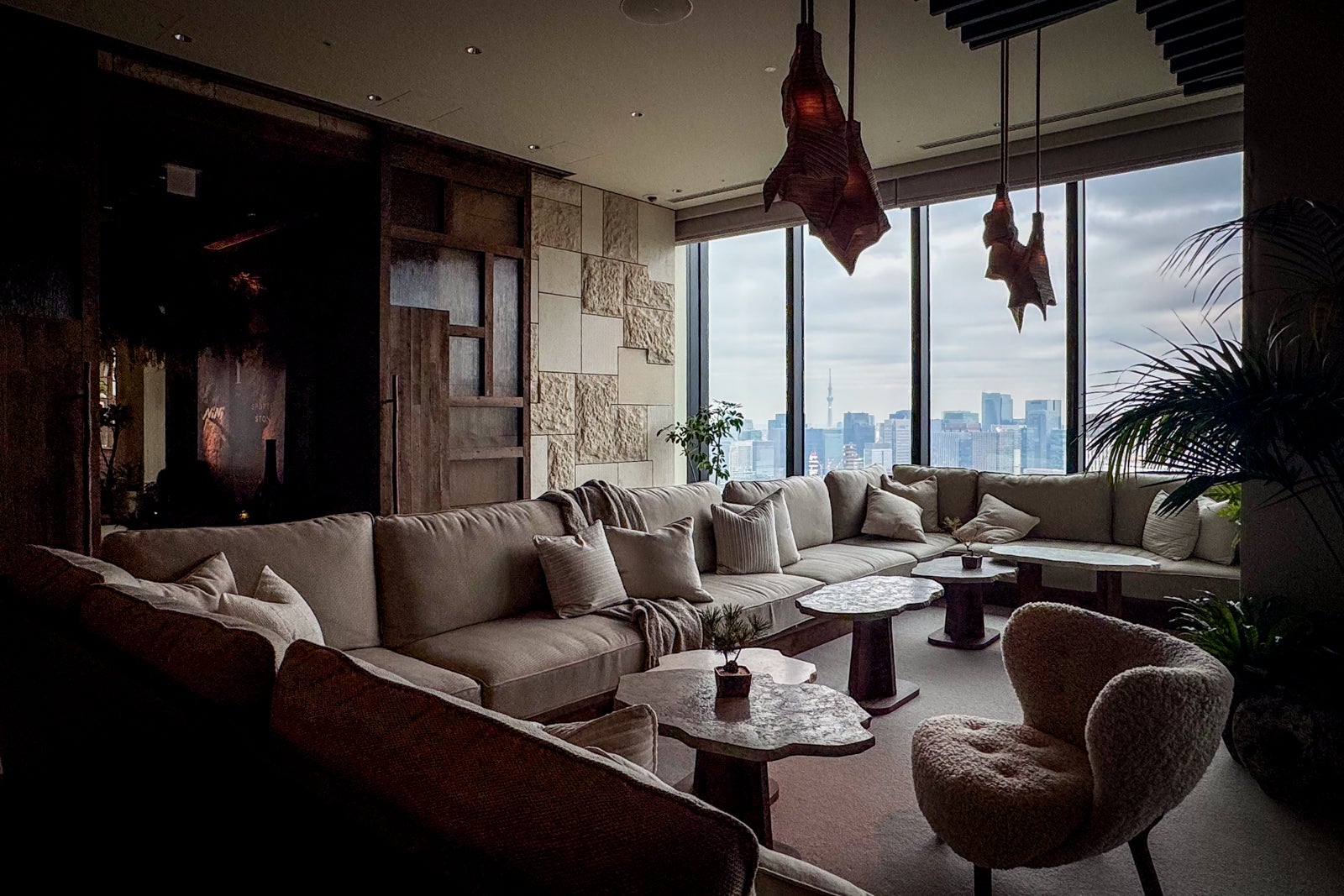Lush greenery abounds, the wooden ceiling beams evoke both the rake patterns of Japanese sand gardens and the roofs of local temples, while expansive white-cushioned sectionals and welcoming seating vignettes with fluffy chairs and leather sofas all look out toward Tokyo Tower and the city's skyline.