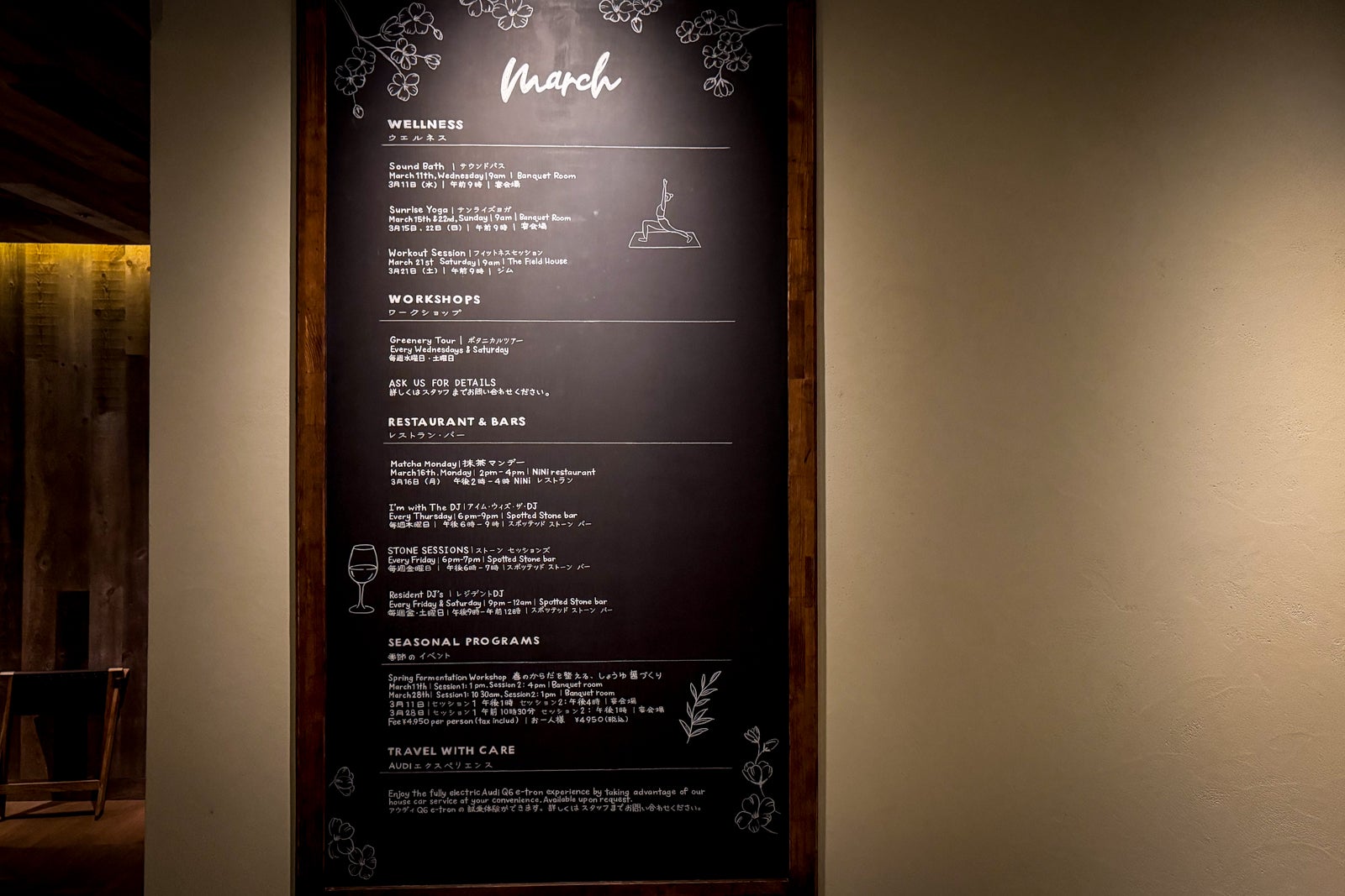 - Check out the lobby blackboard for innovative guest programming, including sunrise yoga, sound baths and fermentation workshops.