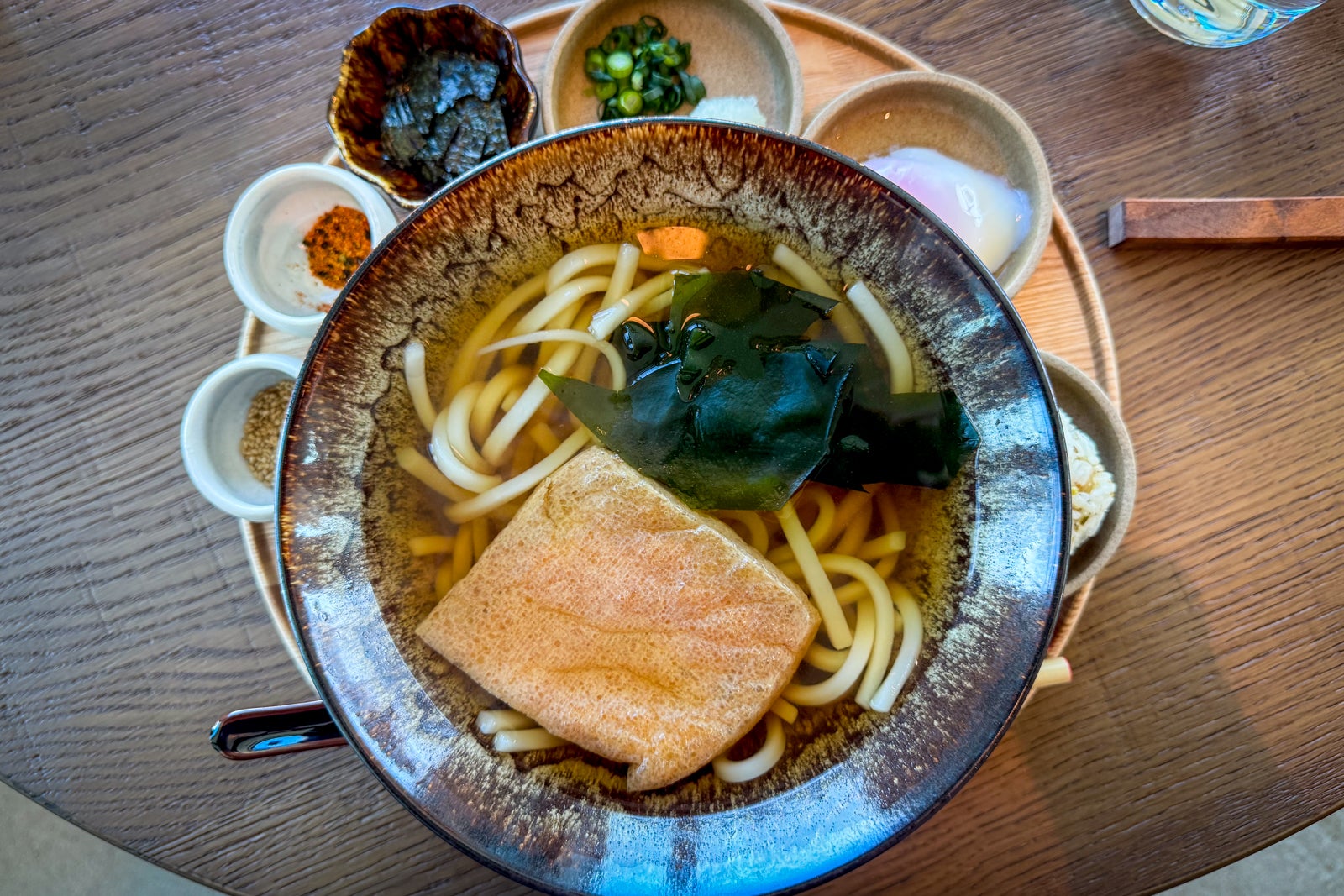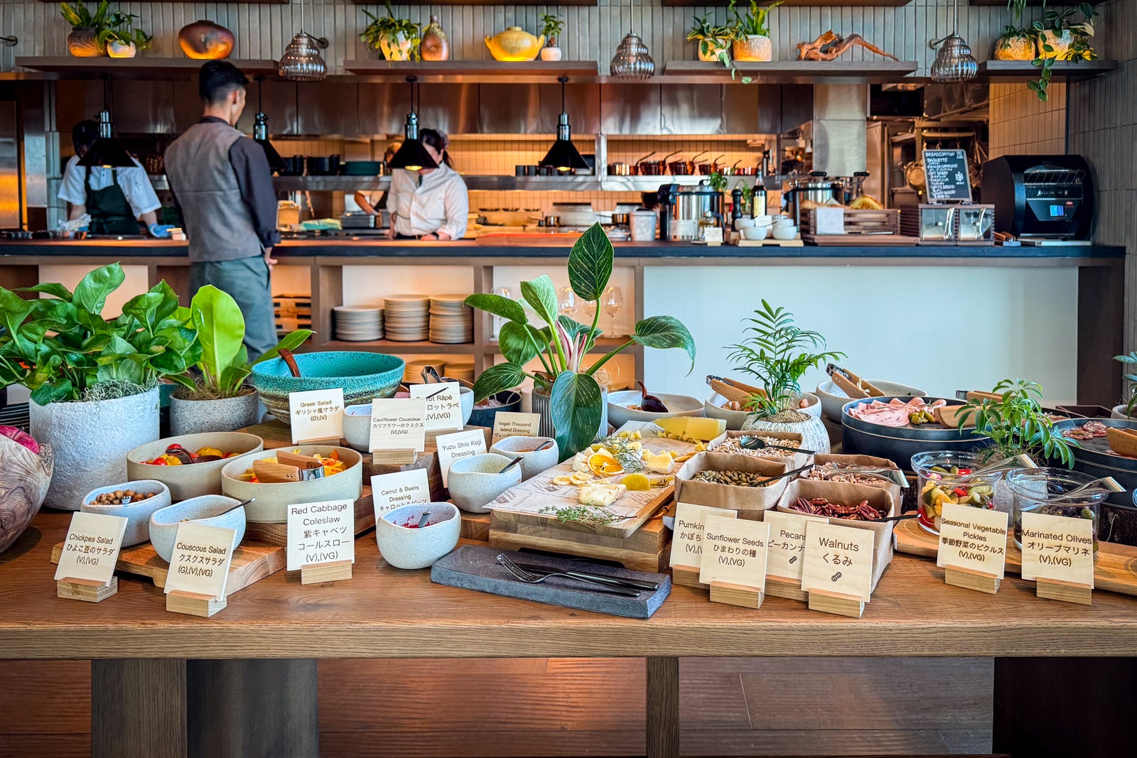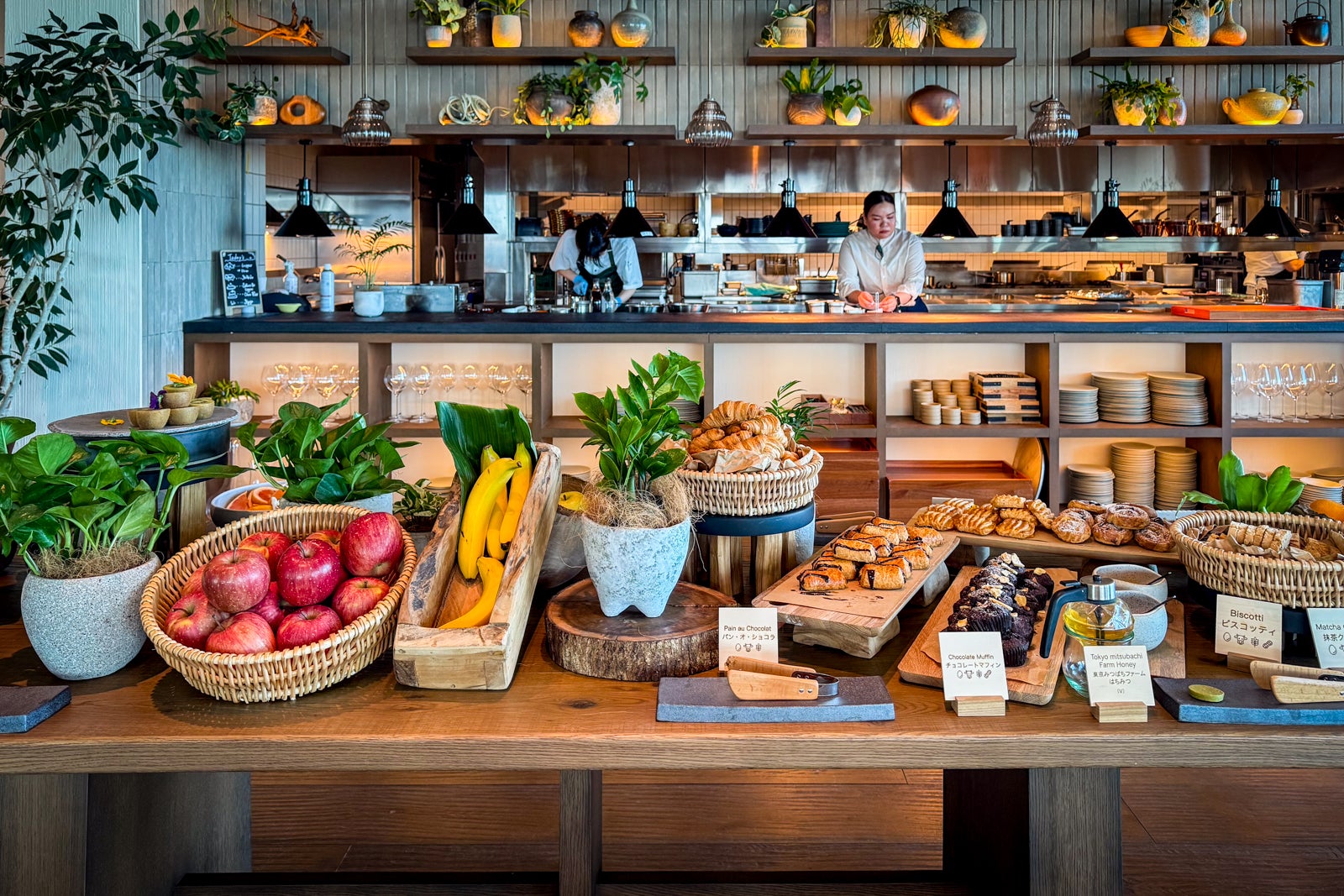 Breakfast, which is also served here, includes a buffet of fruits, pastries and cold cuts accompanied by main dishes like a mushroom tartine with Comte cheese and fried egg, French toast with roasted mikan orange and maple syrup, kitsune udon with an onsen egg, and a profuse Japanese breakfast bento box with a variety of delicacies including maguro tuna sashimi and a traditional rolled omelet (menu for $50 per person with a $10 supplement for the Japanese bento box).