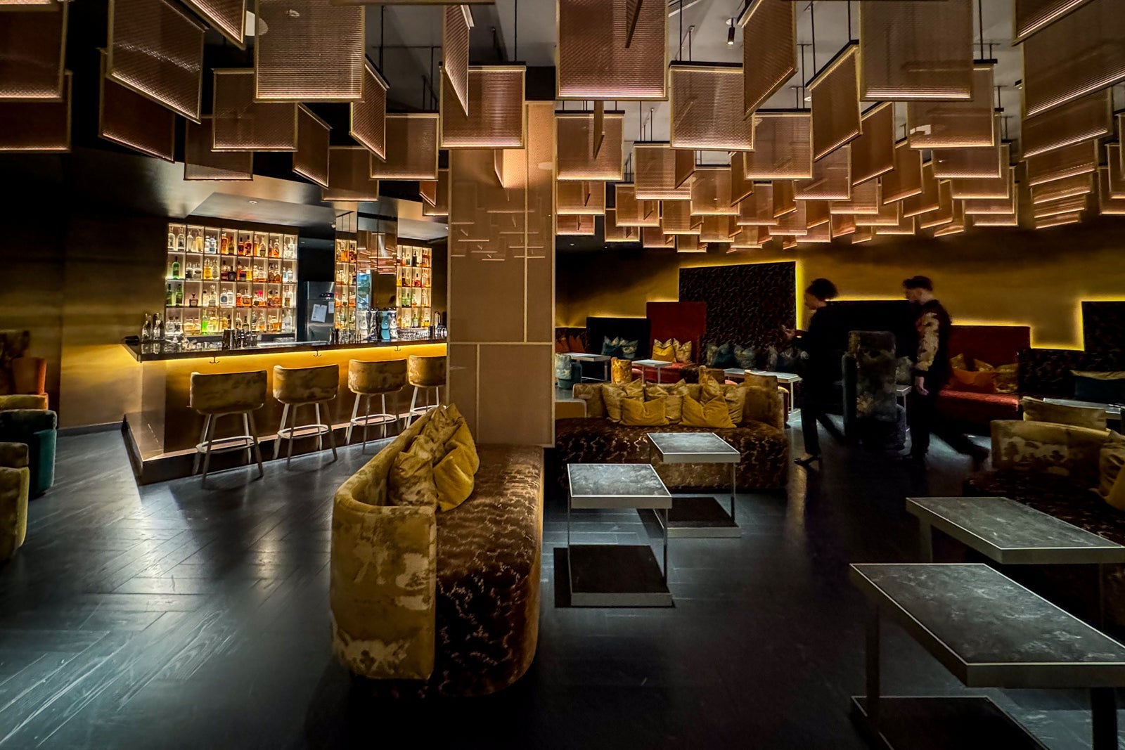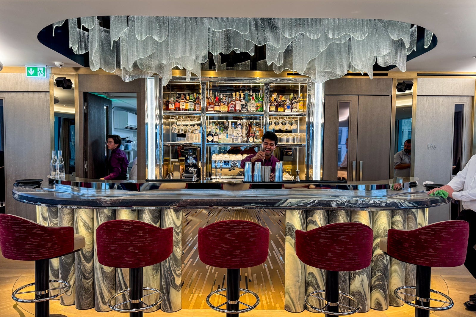 Though not quite open at the time of our visit, we did get a sneak peek at ABar Rooftop on the top floor. The Art Deco-style decor and the palette of blues and grays were inspired by the London sky, including a cloud-like textured light fixture over the dramatic marble bar.