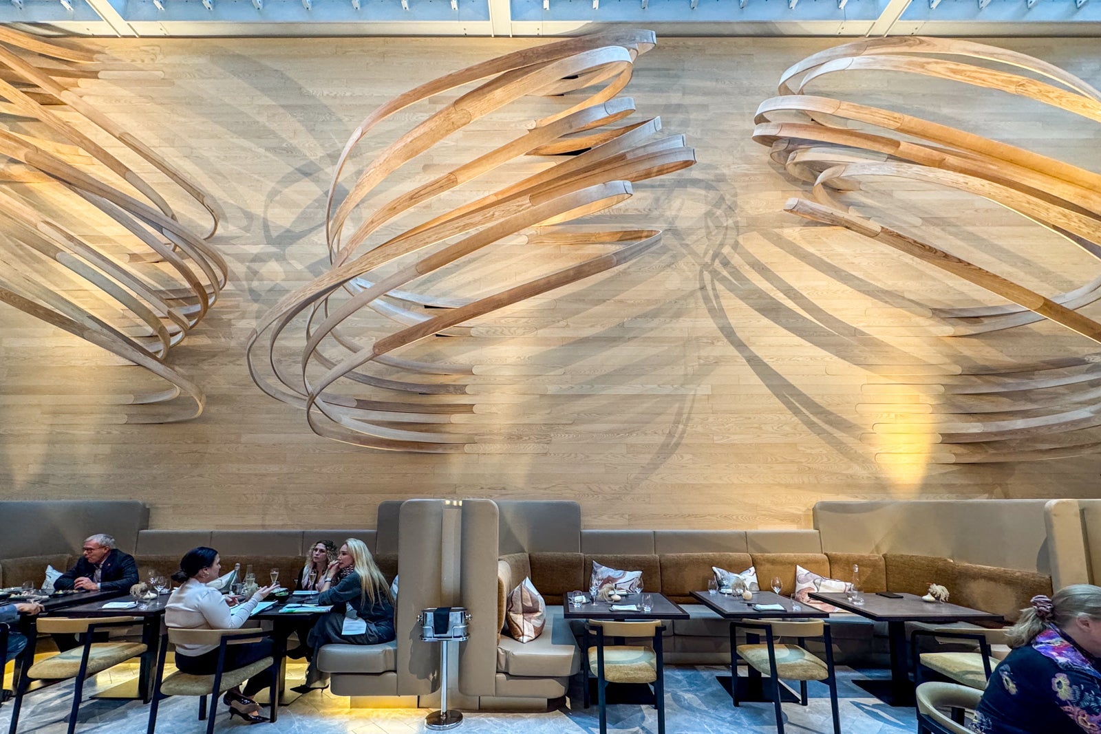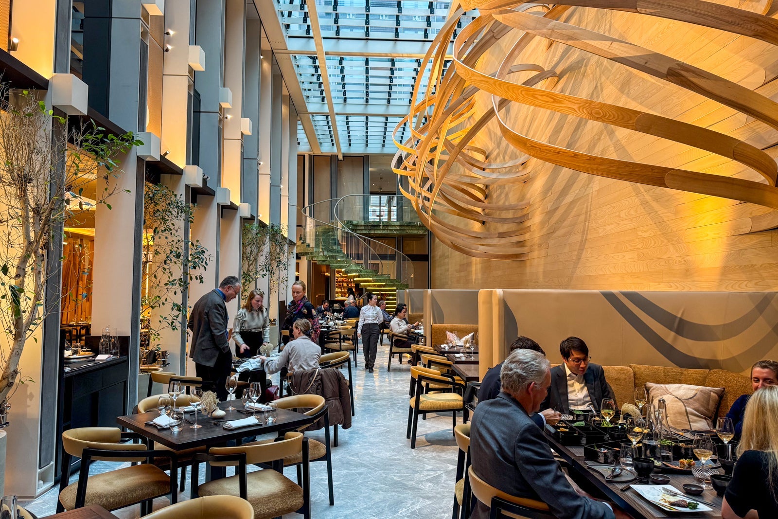 The atrium-like space is illuminated by enormous skylights and has dramatic artistic installations including a swirling wooden sculpture affixed to the wall and paintings by the chef's own mother (you might also pick out her designs on some of the plates).