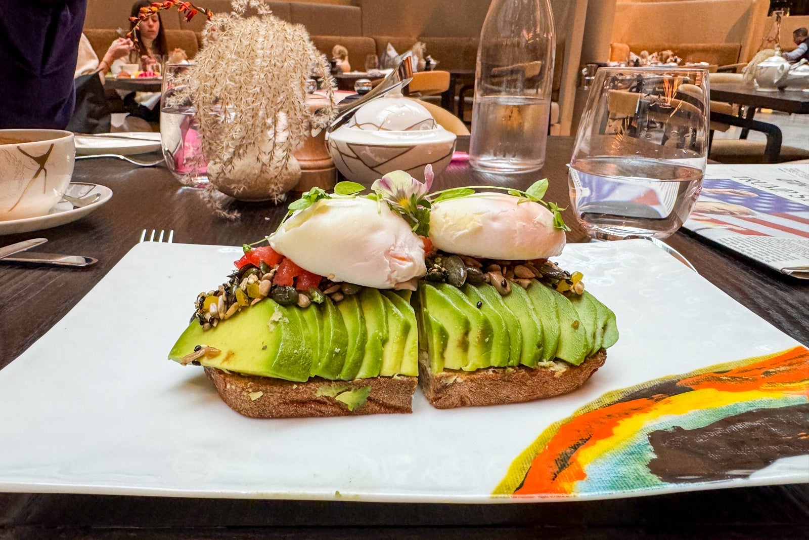 Breakfast is a leisurely affair as guests peruse the morning newspapers over dishes like avocado toast with artichoke pesto, confit tomato, pepper and seed tabbouleh with poached eggs ($24); a breakfast bento with salmon teriyaki, glazed mushrooms, spinach salad, onigiri, egg castella cake, miso soup and fruit ($48); and the specialty gianduja croffle with hazelnut ganache and vanilla Chantilly cream ($28).