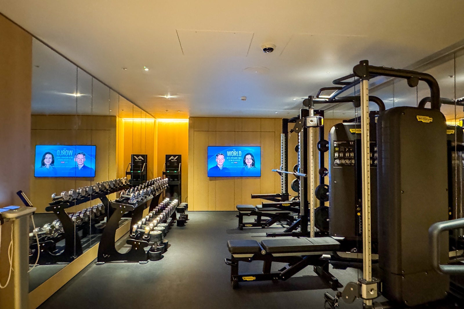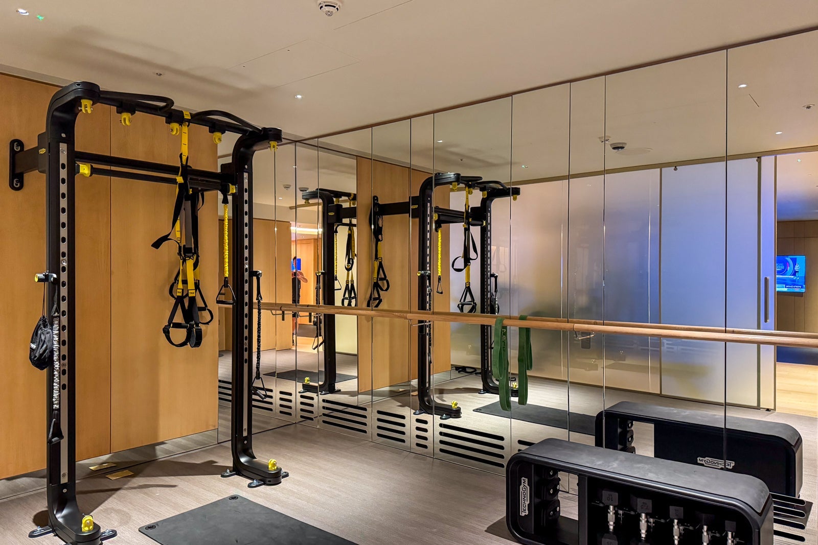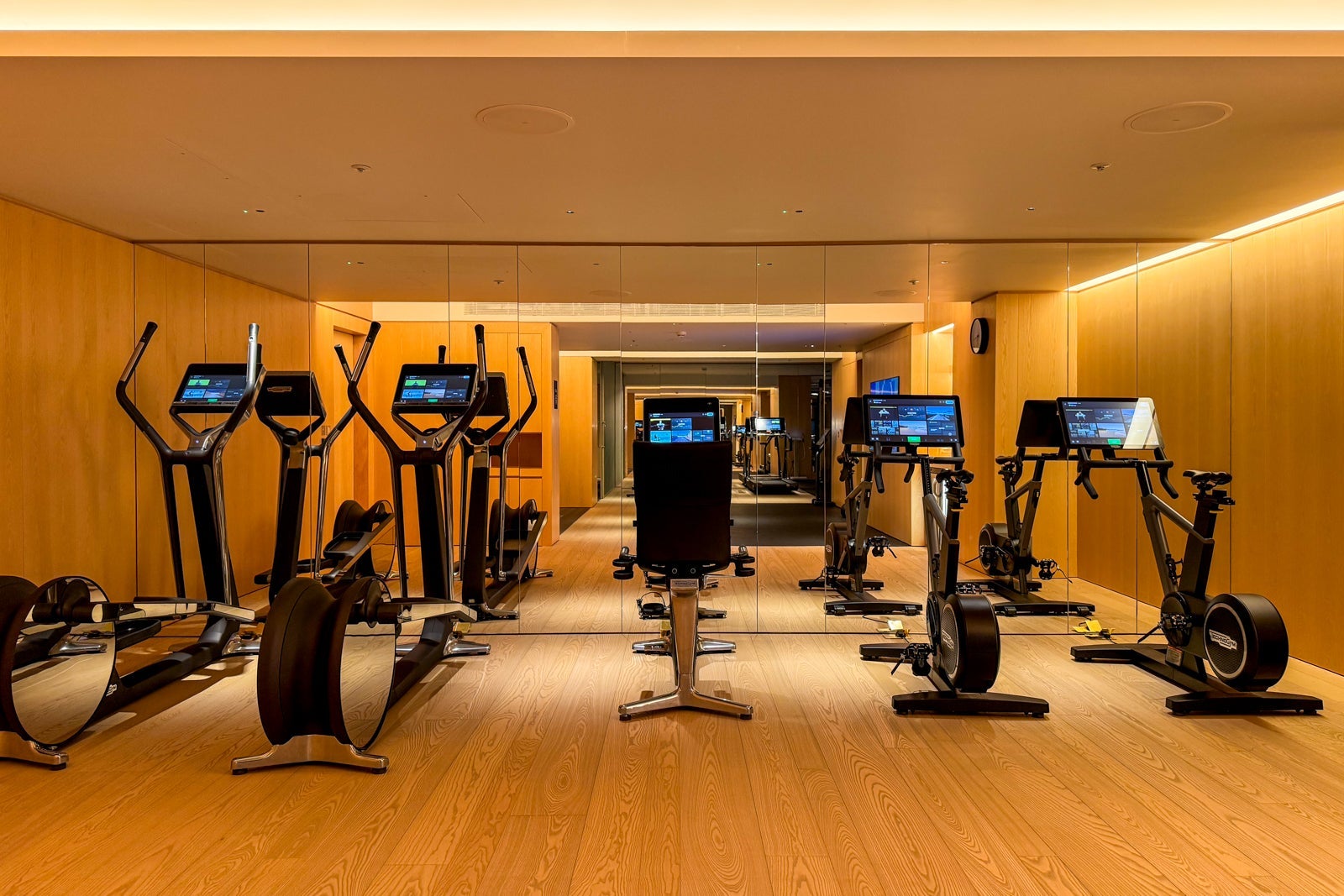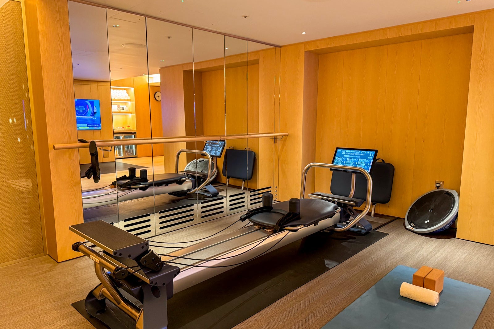 The gym is equipped with TechnoGym cardio machines and weights, a Pilates reformer and areas for stretching and yoga, and personal training services are available.