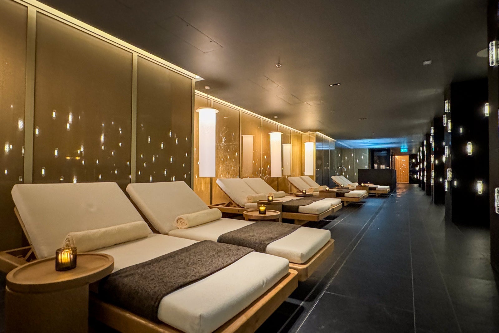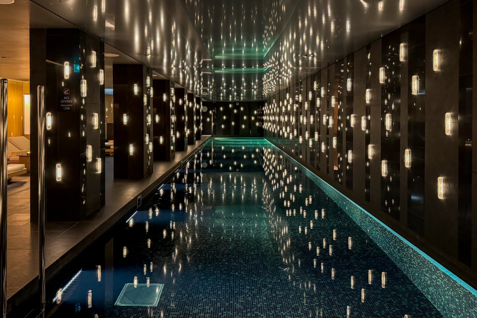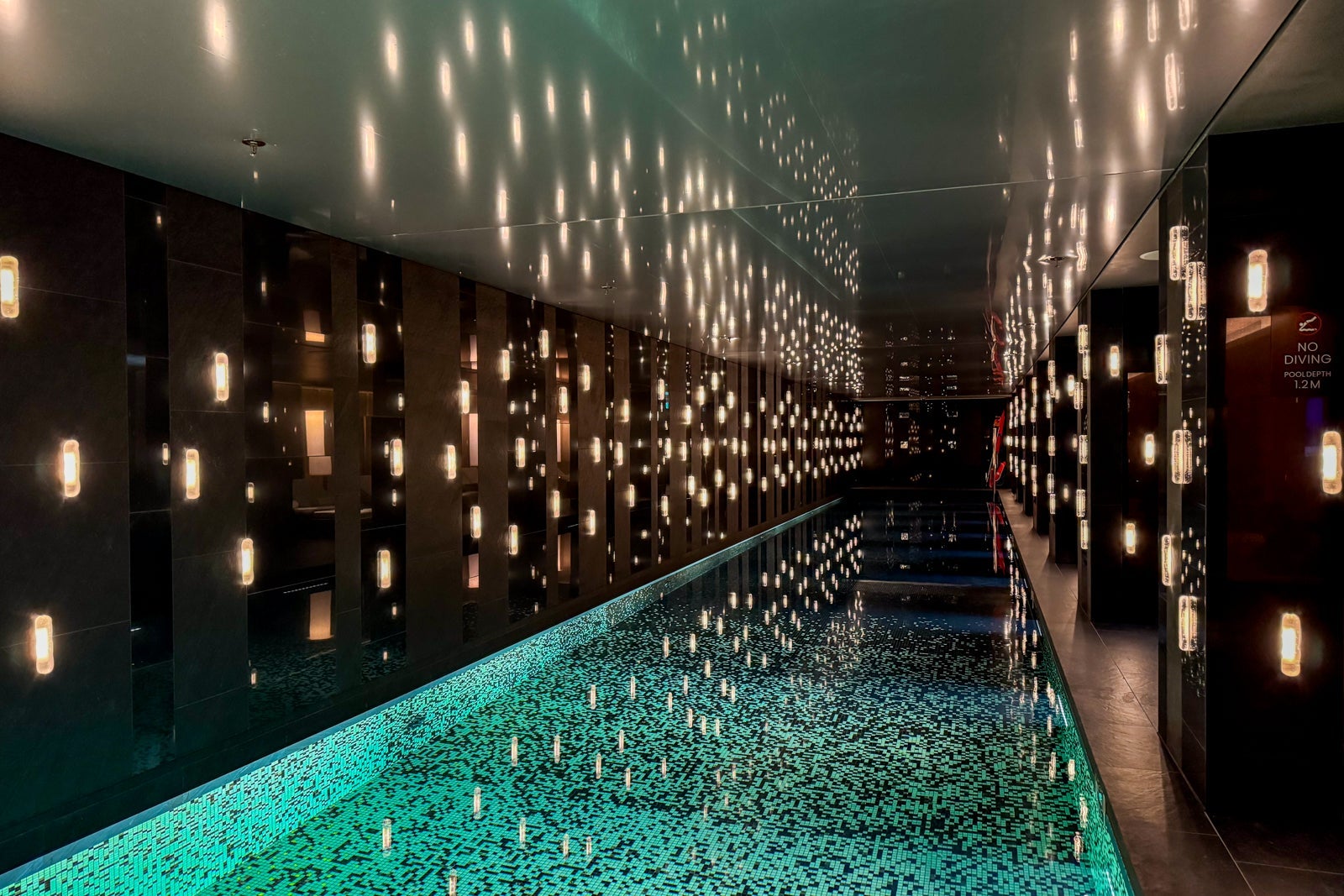 Bring your bathing suit because you won't want to skip a dip in the 25-meter pool, which has different dark and light sections and is ingeniously lit with reflective surfaces so it feels like you're floating amongst the stars. The wet area also includes a sauna, steam room, small therapy pools and loungers.