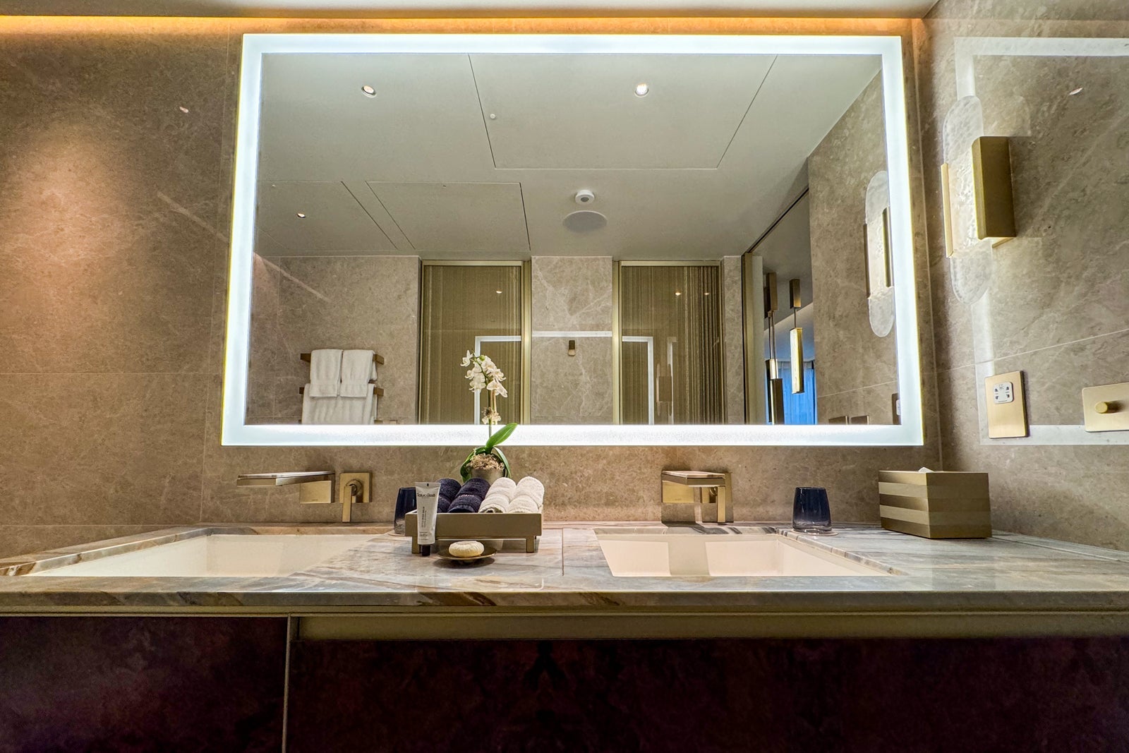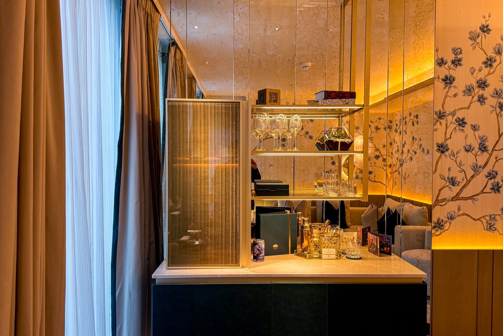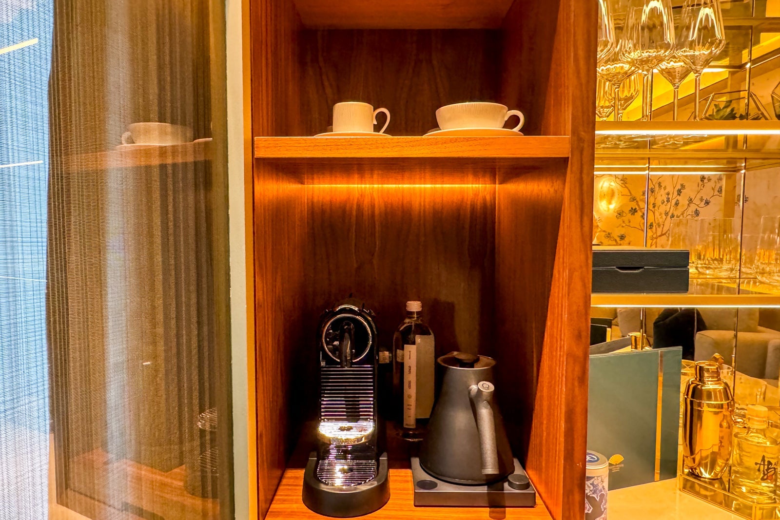 There was also a beautiful mirrored minibar stocked with a Nespresso machine and an electric kettle, plus complimentary treats including a bottled cocktail from Akira Black.