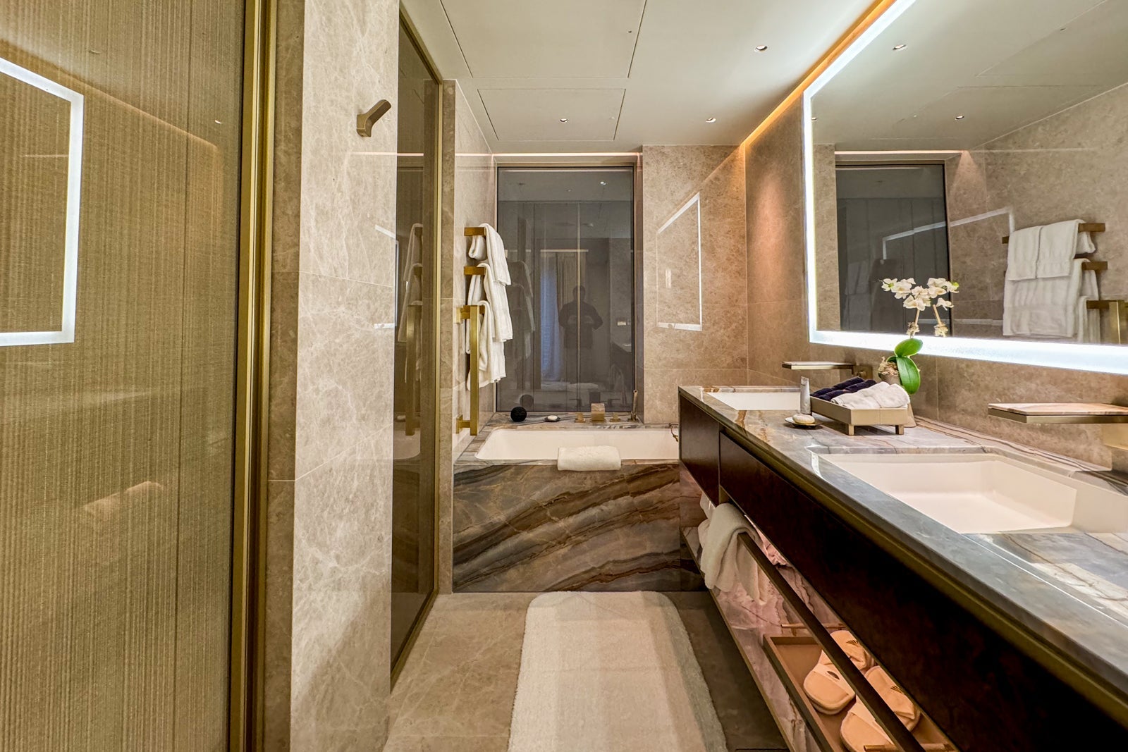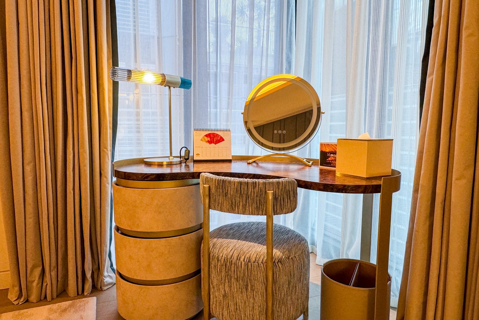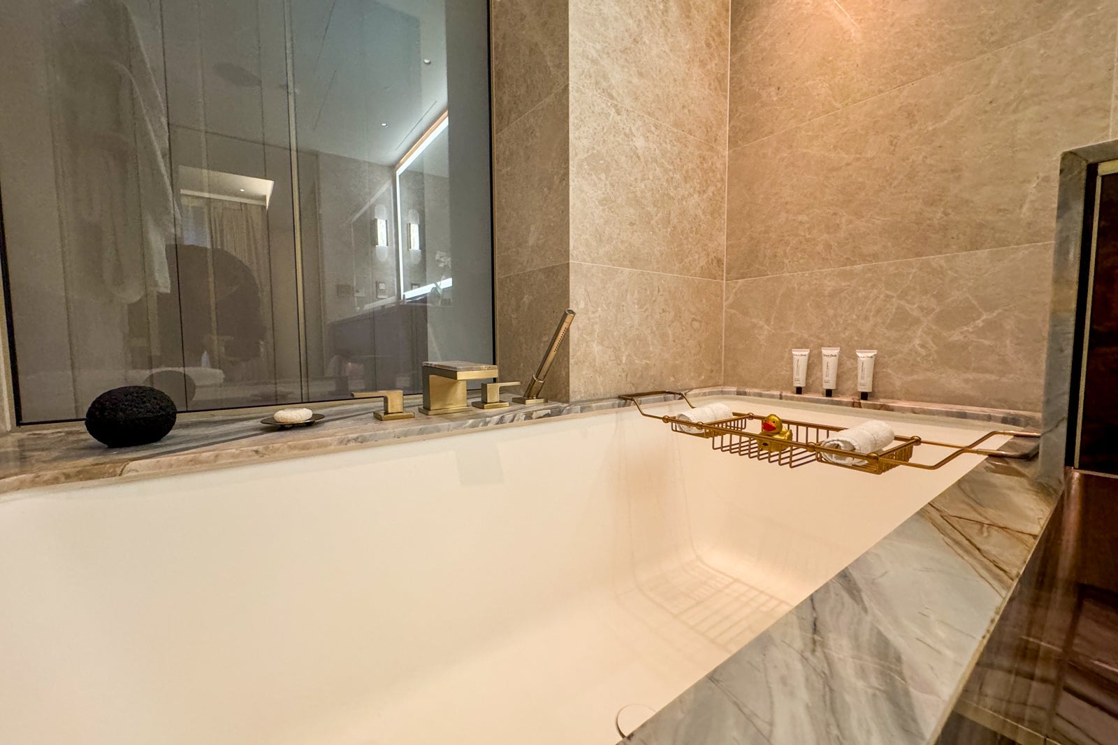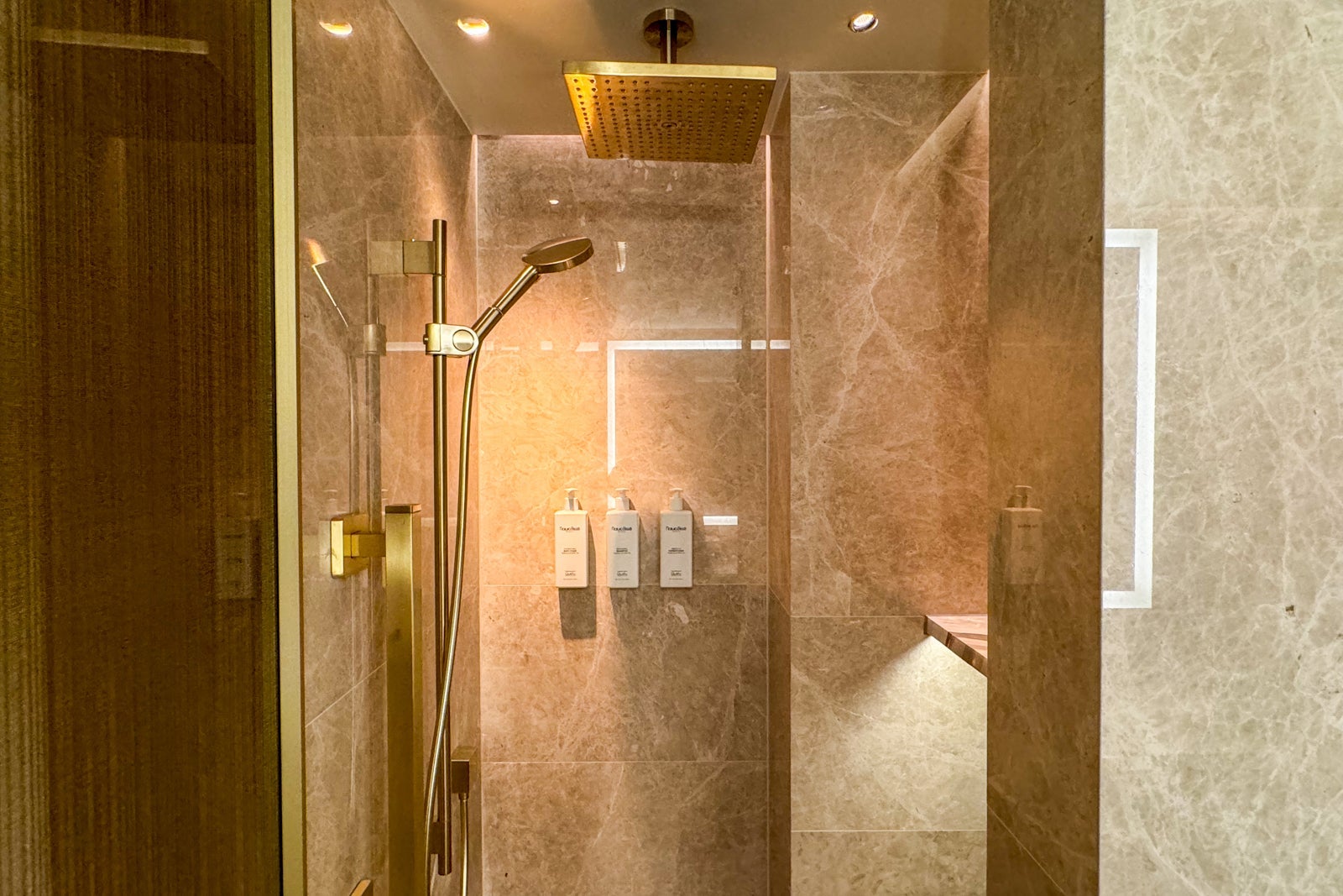 There was also a beautiful mirrored minibar stocked with a Nespresso machine and an electric kettle, plus complimentary treats including a bottled cocktail from Akira Black.