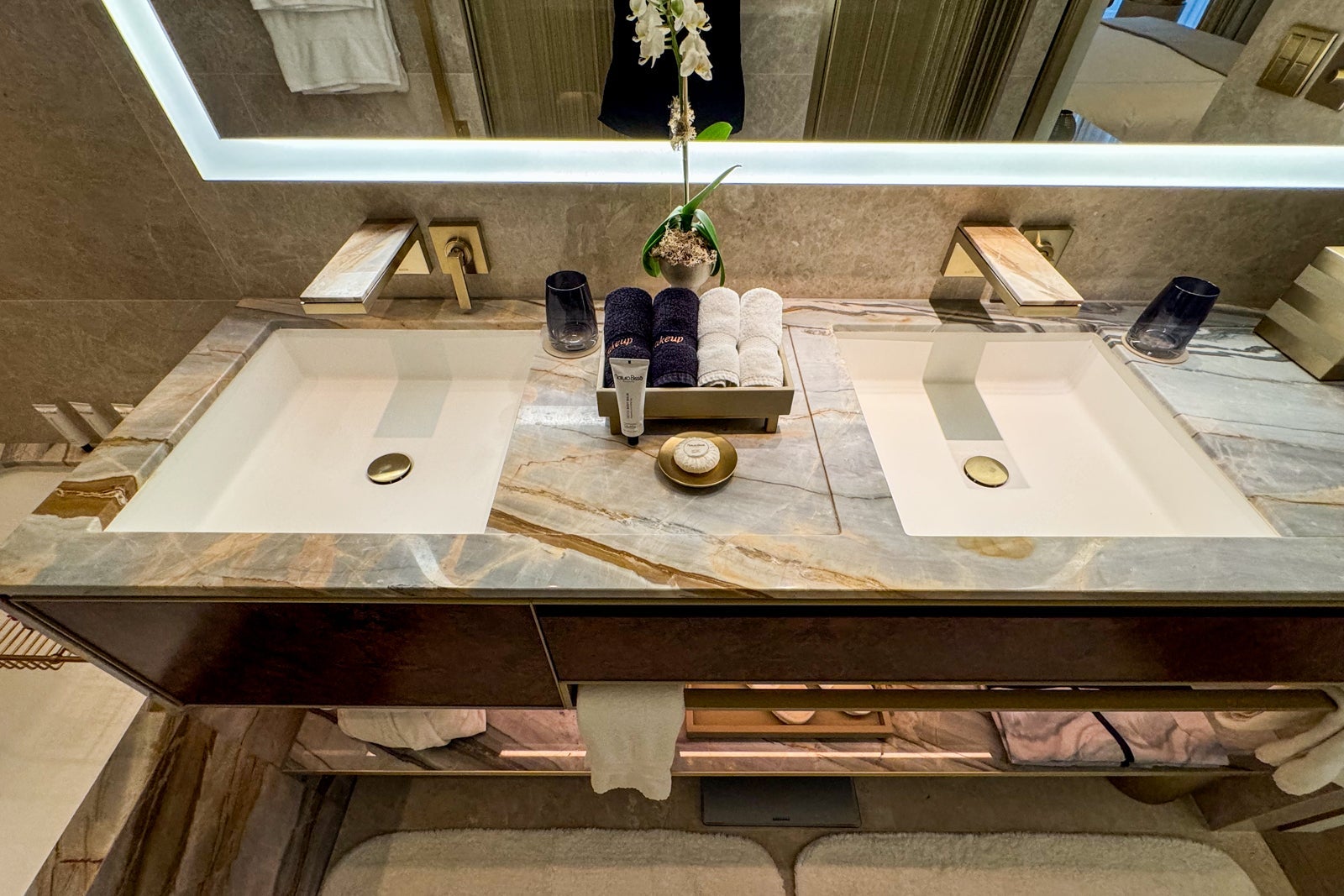 At the far end, past the dual-sink vanity, was a soaking bath provisioned with Natura Bisse products. The window next to it looked into the entry foyer but could be fogged up for privacy with the touch of a button.