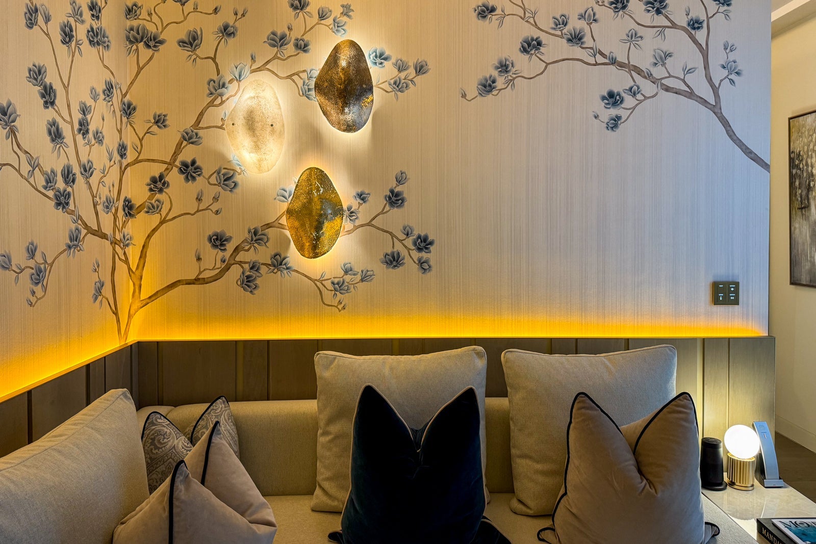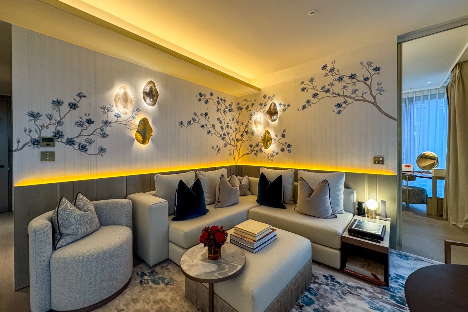 Stepping through the entry foyer, the first space I came to was the living room, its walls adorned in ornate, hand-painted de Gournay silk wallpaper with chinoiserie floral designs in turquoise inspired by Hanover Square's magnolia trees — a visually alluring nod to the hotel's distinctive locale.
