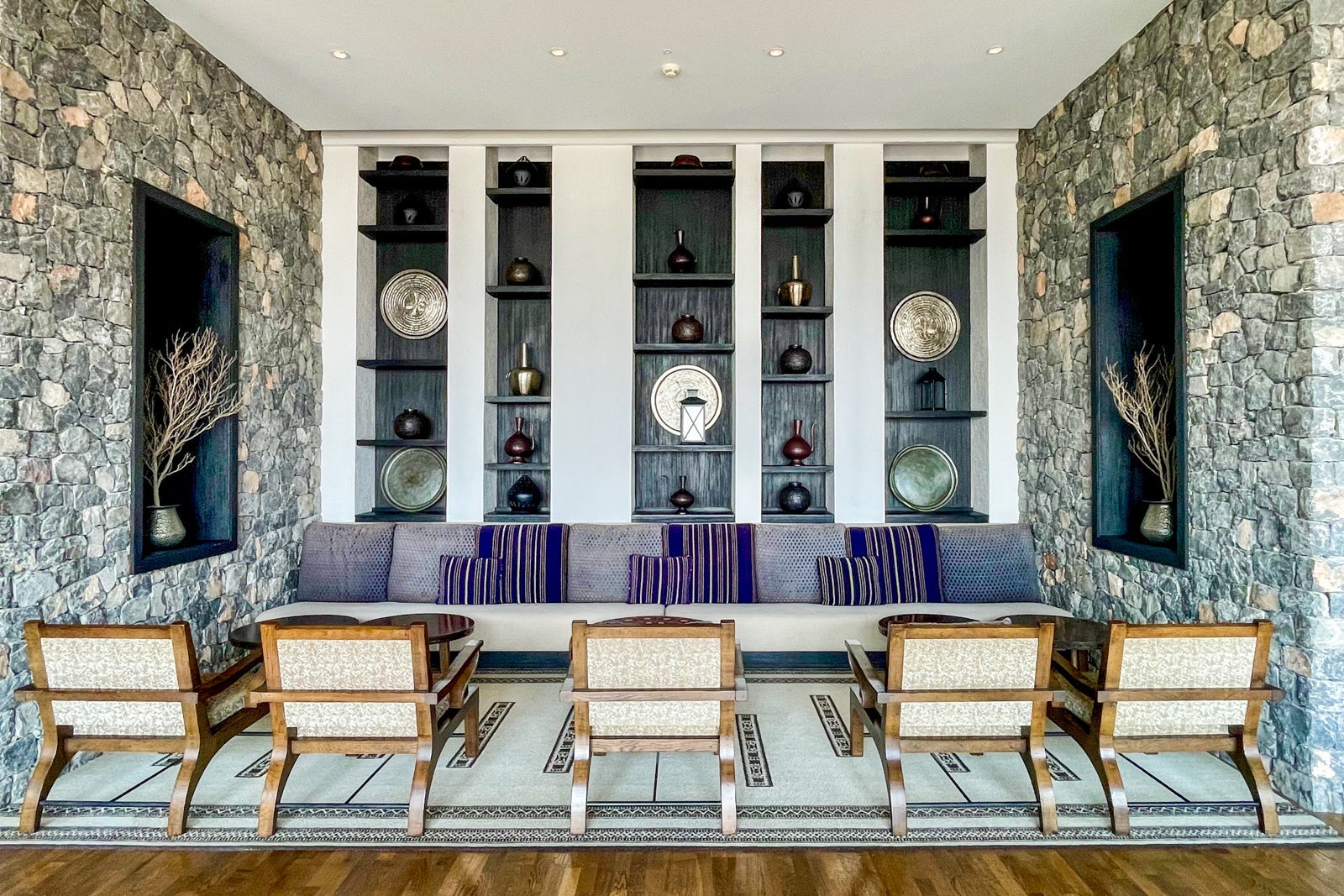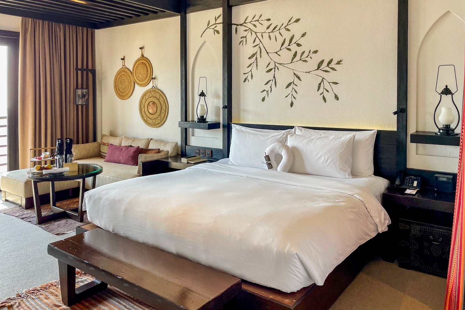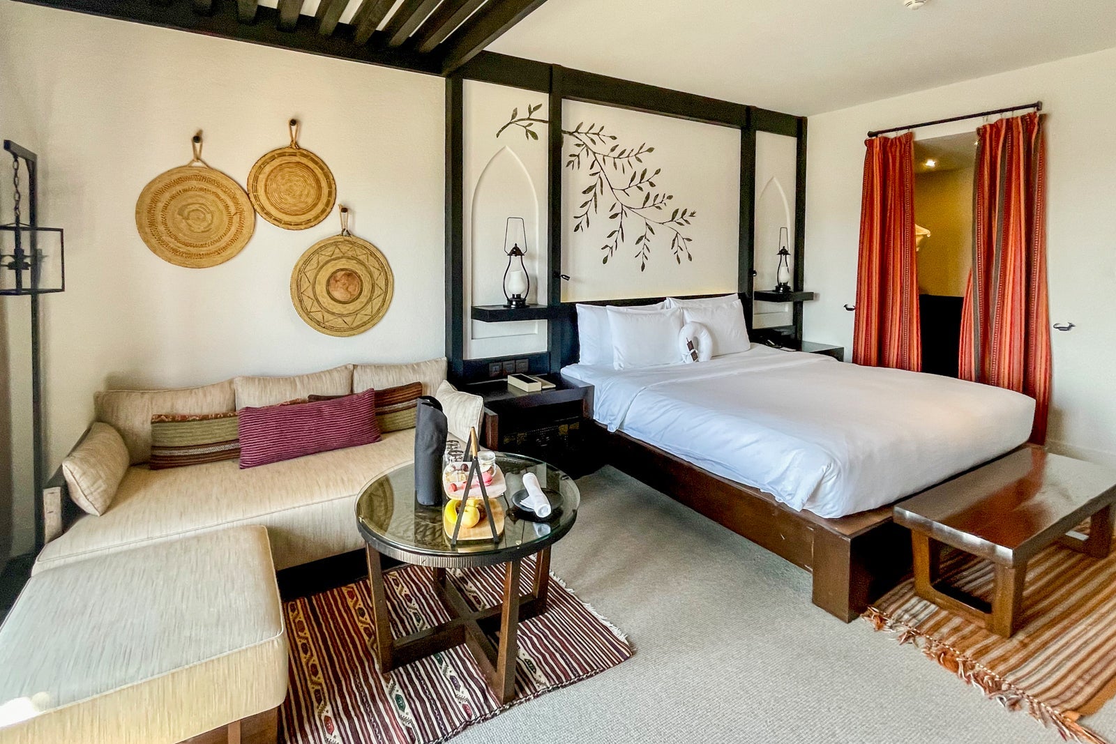 With traditional Omani design principles, the rooms at this property blend Islamic, Arab and Persian architectural styles with distinctive elements such as intricately carved wooden doors and window frames, breezy furnished balconies and decorative patterns that adorn the walls. The rooms have a natural, earthy yet elevated appearance, with lanterns and heavy wooden chests.
