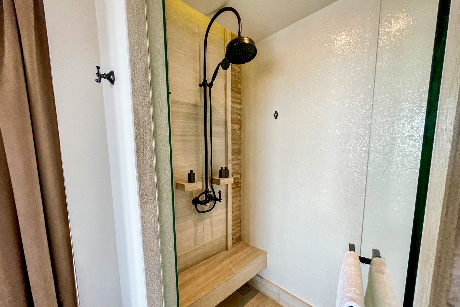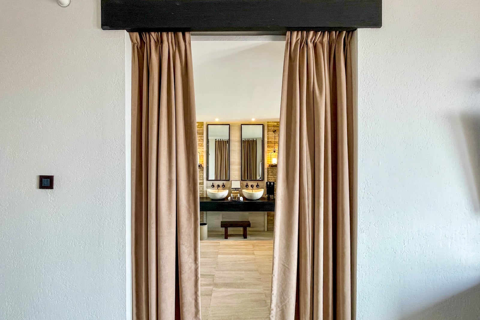 Moving through a tall, curtained doorway into the large bathroom, there was a ceramic bathtub, which might be a squeeze for two people, and guidance to fill it partially with cold water first, then hot water so it doesn't crack, along with some relaxing bath salts. There was a double vanity with two sinks, a separate shower with strong water pressure and a water closet with the toilet.