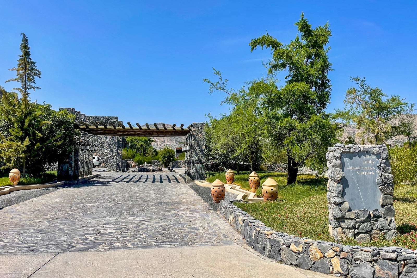 The hotel is about a 2 1/2-hour drive from Muscat International Airport (MCT). An hour away from the hotel is the Birkat Al Mouz police checkpoint. You cannot pass this checkpoint unless you are in a four-wheel-drive vehicle due to the steep ascent into the mountains. Therefore, if you rent a four-wheel-drive vehicle from the airport, you can drive yourself the whole way.