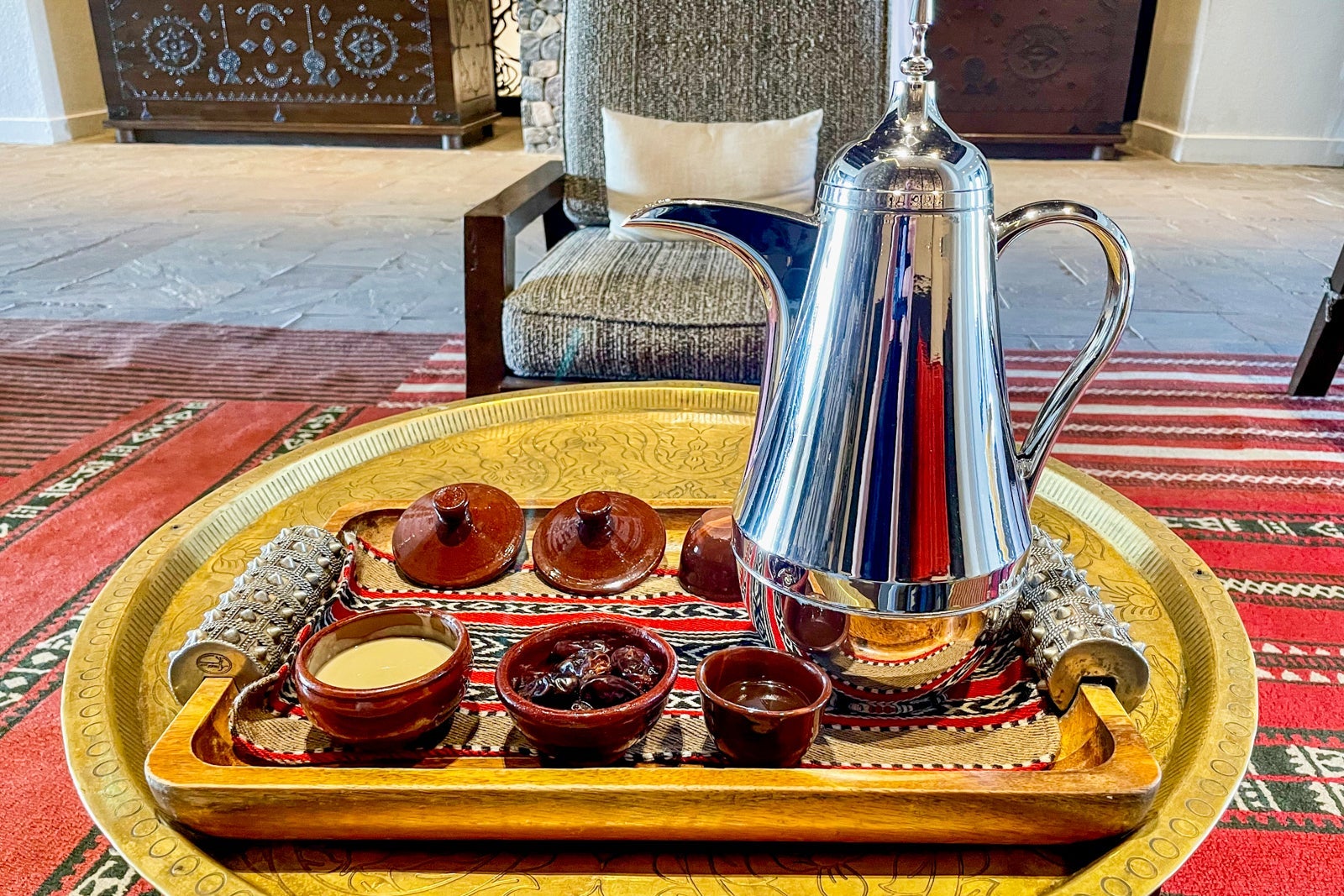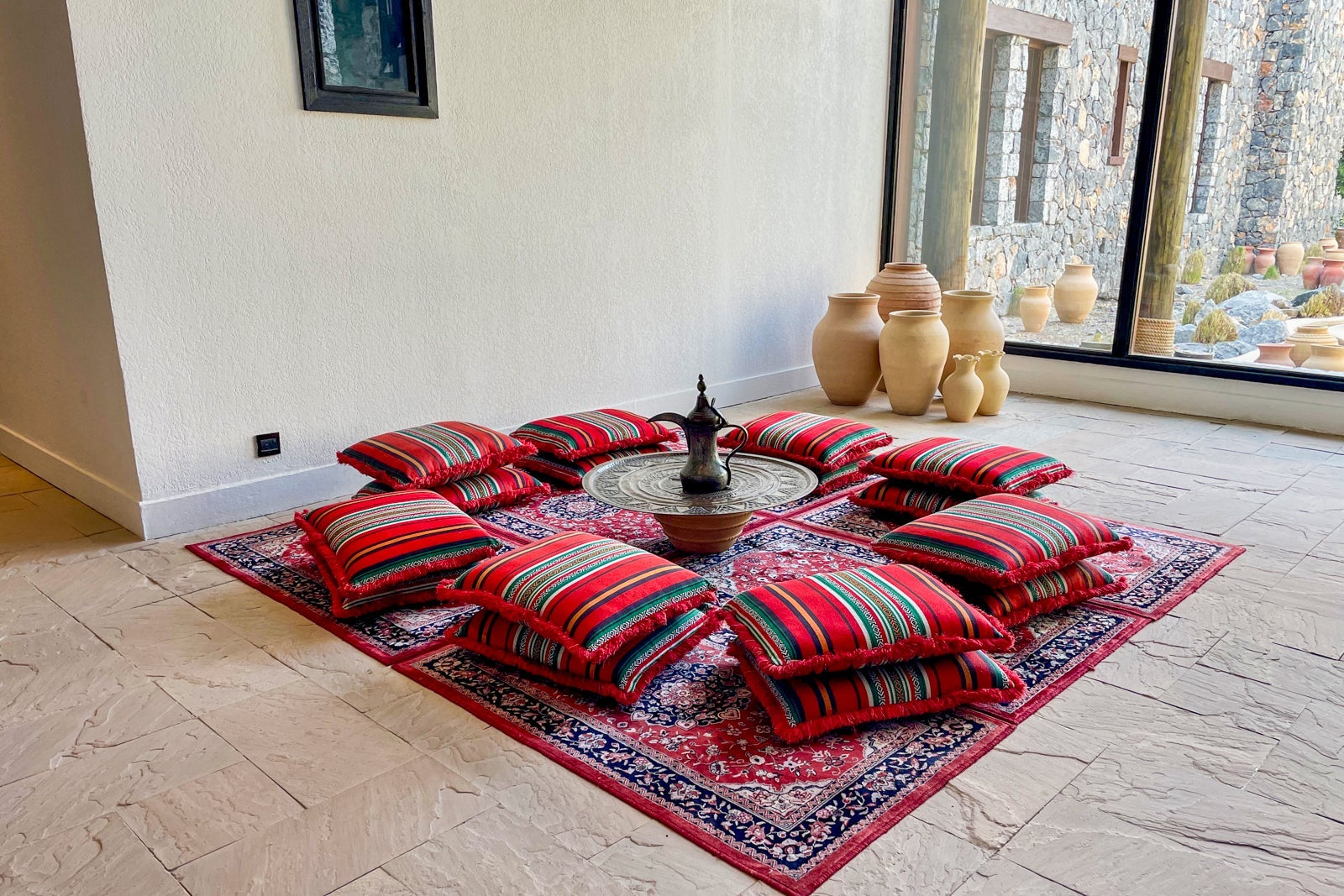 There, welcome formalities are carried out over Arabic coffee and dates with tahini. After the winding hourlong drive up the mountains, it was relaxing to recline on a comfortable couch against the wall, taking in the welcome area's beauty and an Omani welcome tradition.