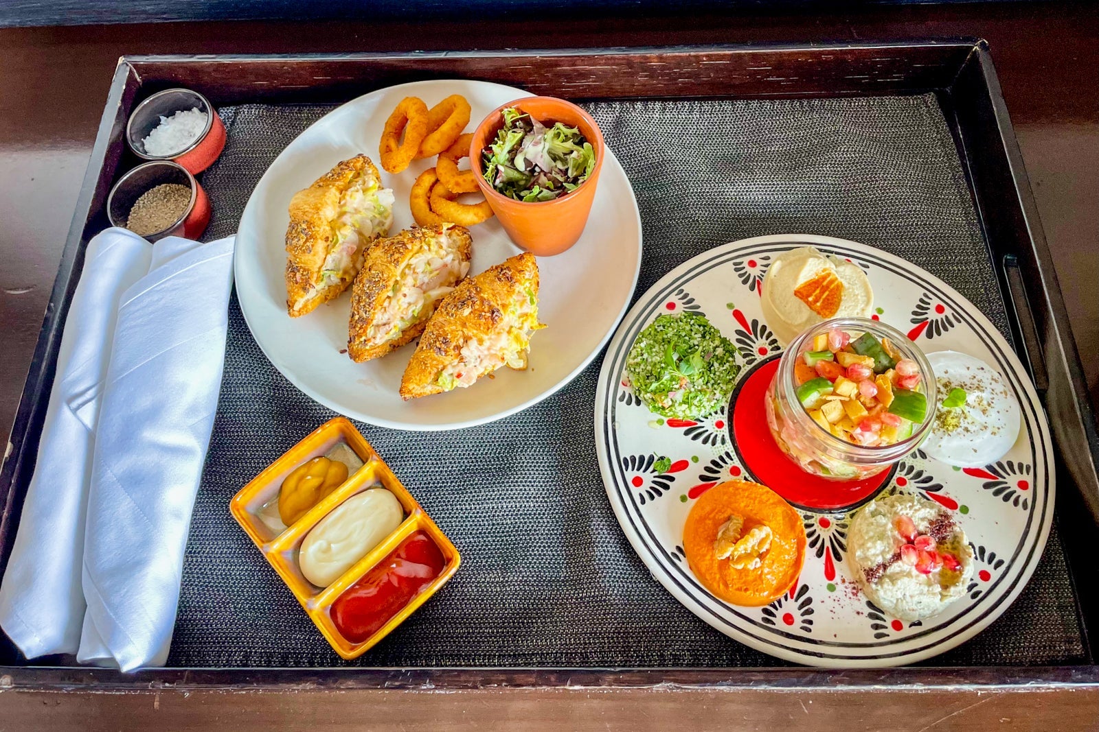 Finally, I had room service for lunch one day: a huge mezze platter for 10 Omani rial (about $26) and to-die-for, uniquely sweet lobster croissant sandwiches for 15 Omani rial (about $39).