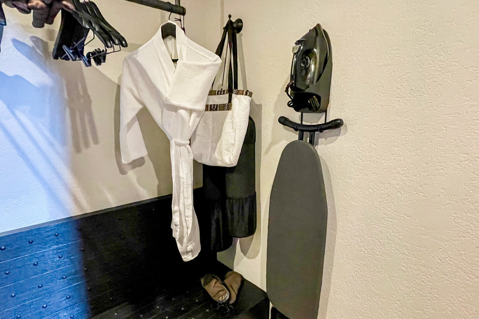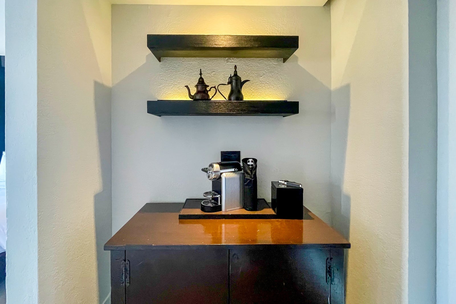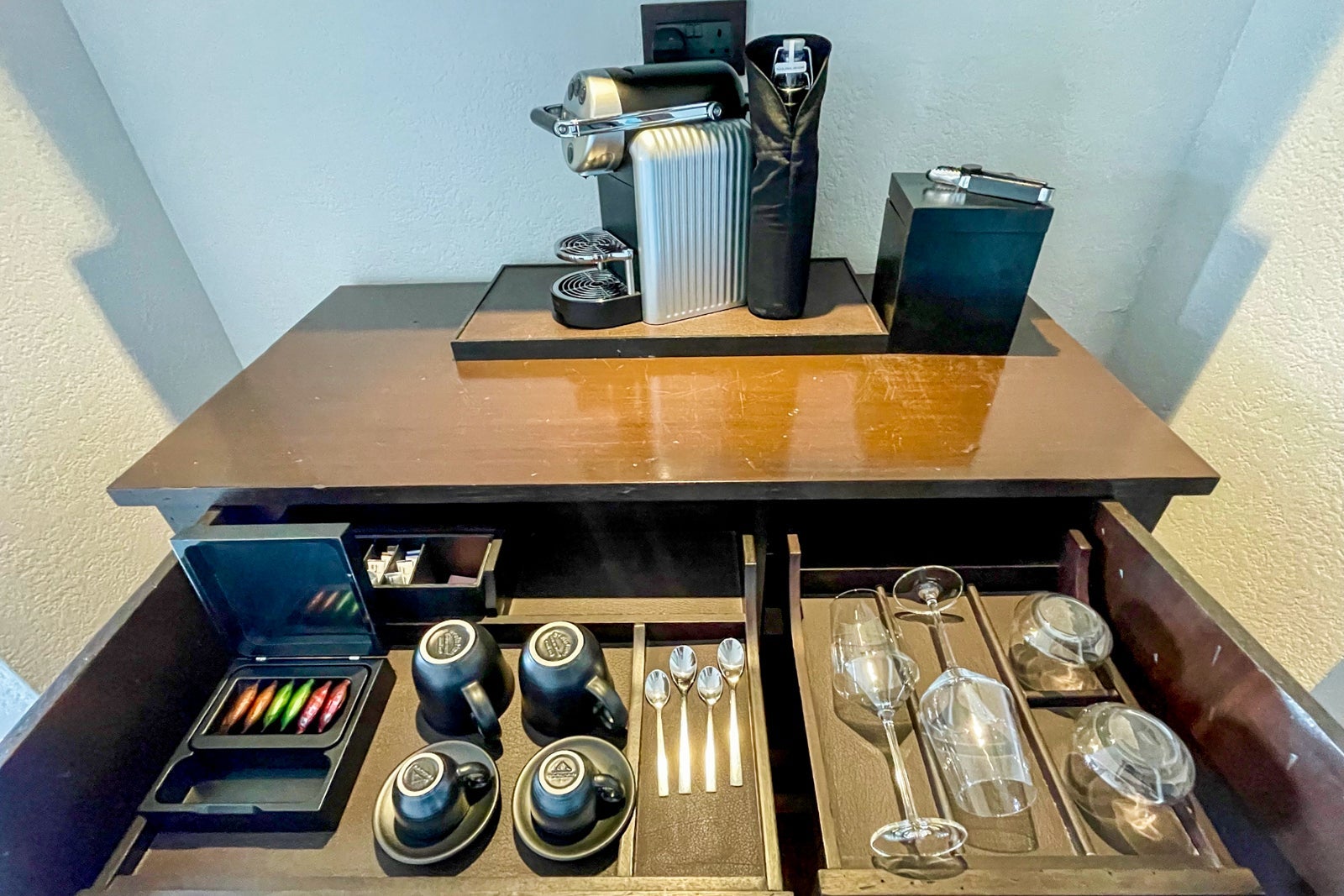 Moving onto the room's amenities, there were a large flat-screen TV, plush robes (which were too small for my 5-foot-11-inch frame), an attractive and handy tote bag, two yoga mats, a flashlight, a Nespresso coffee machine and assortment of tea bags, complimentary soft drinks and unlimited bottled water, a safe, universal power and USB charging outlets located on both sides of the bed and on the desk, and well-functioning air conditioning.