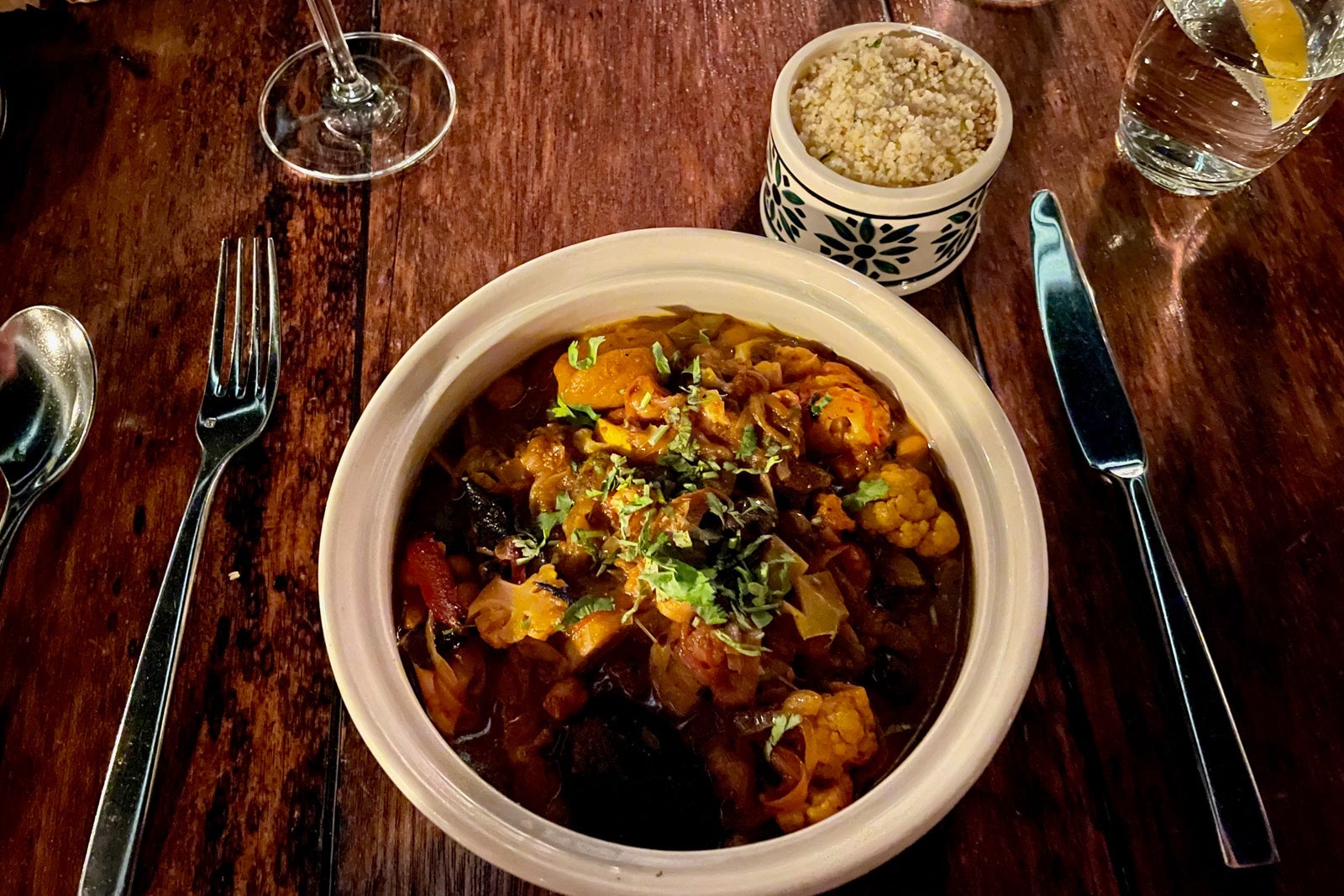 For my appetizer, the Thai chili prawns with a dense and spicy sauce for 16 Omani rial (about $42) were a standout but, unfortunately, were served lukewarm — perhaps they stood for too long waiting to be delivered to my table. Moving on to the main course, the vegetarian tagine with couscous for 12 Omani rial (about $31), while filling, tasted dull rather than as flavorful as its appearance would suggest.