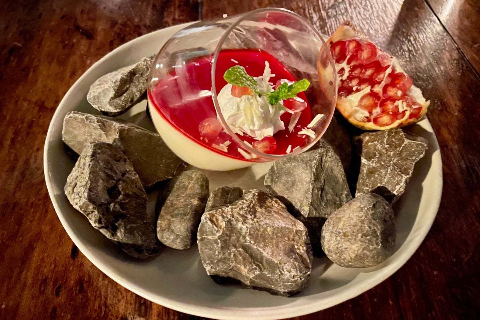 As for dessert, the signature "Mother of the Mountain" panna cotta for 9 Omani rial (about $23), which was served with pomegranate syrup, was truly delectable and plated dramatically over a layer of rocks to evoke the local environment.